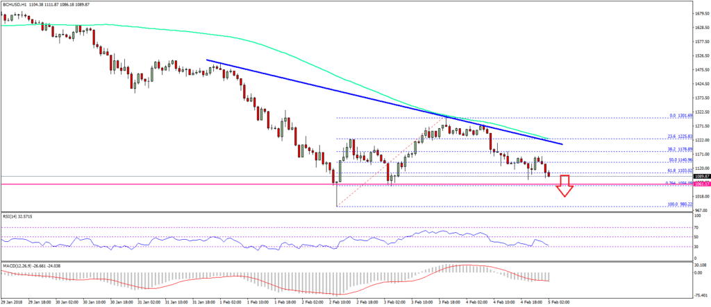 Движение вверх было ограничено критической медвежьей линией тренда с сопротивлением на уровне $ 1220 на часовом графике BCH/USD. Пара в настоящее время торгуется ниже уровня в 1,100$ и направляется в область поддержки к 1,000$. В скором времени он сможет проверить уровень Фибоначчи 76,4% от волны роста с $ 980 до $ 1,301. Прорыв ниже уровней $ 1080 и $ 1060 может подтолкнуть цену к уровню $1,000 . Указанный уровень в размере 1000$ и уровни поддержки в 980 долларов являются важными.