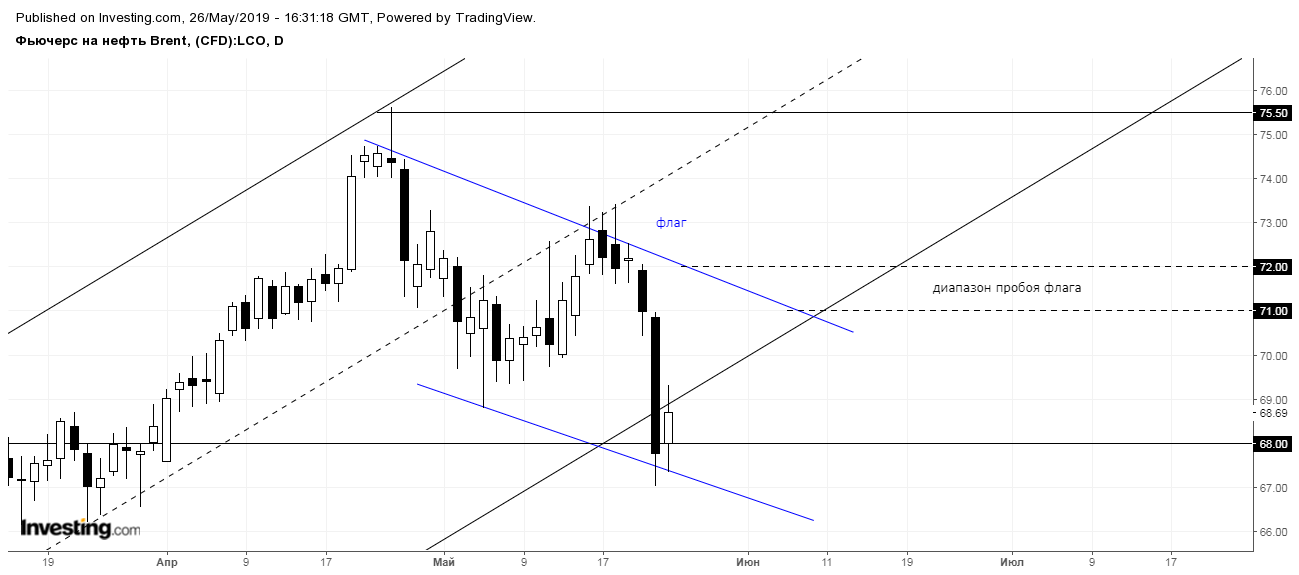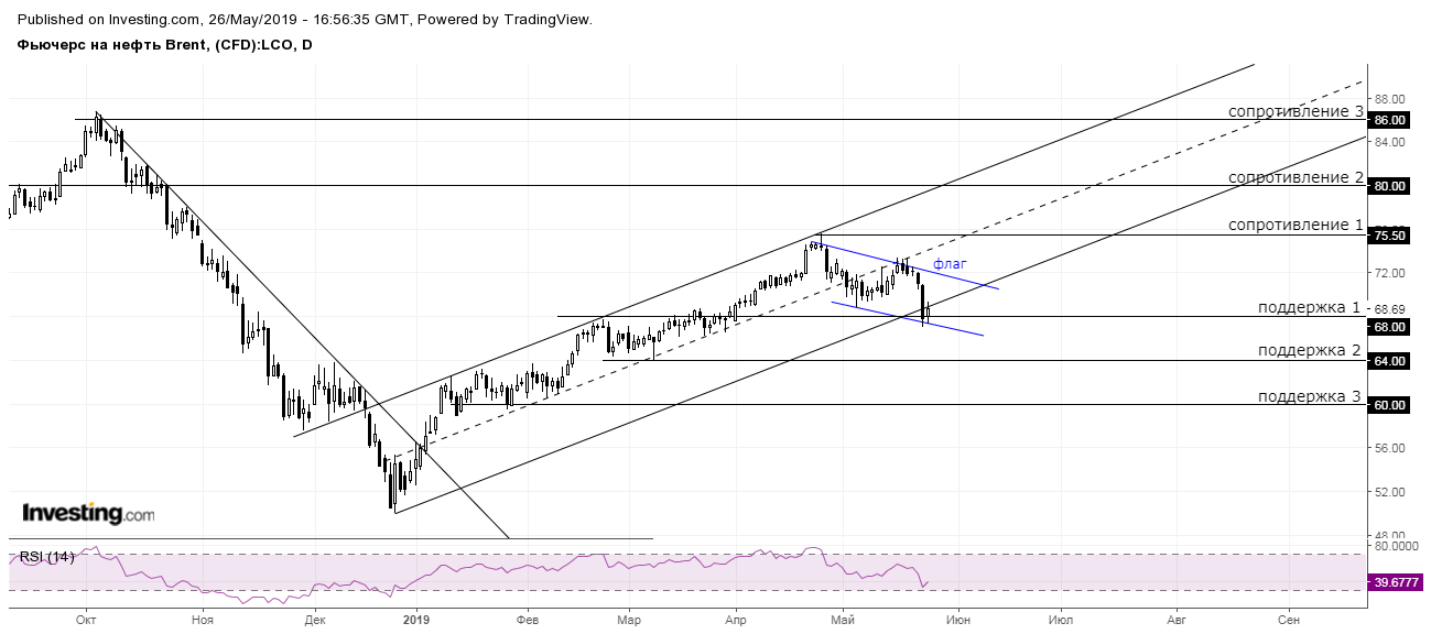 Второй вариант – снижение цены. Реализация данного сценария возможна в результате пробоя уровня поддержки 68$ и нижней границы восходящего канала. В таком случае нефть может снизиться к уровням поддержки 64$ и 60$, соответственно.