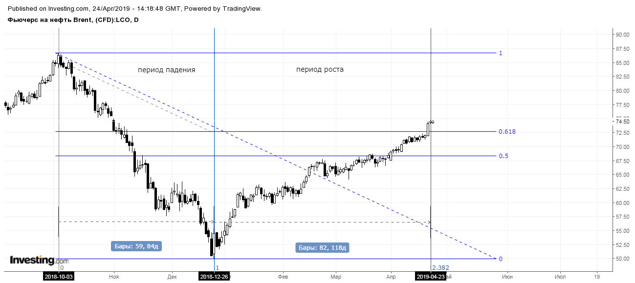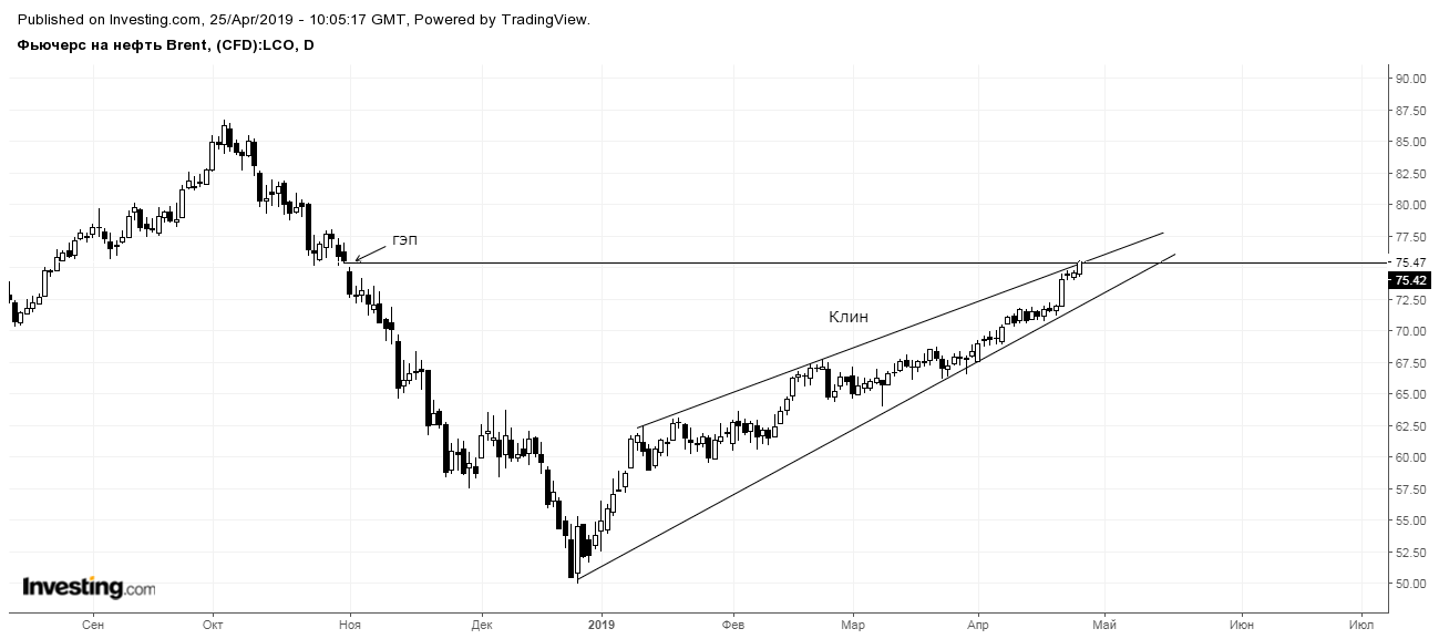 Сергей ЛеньшинНапомню, что в прошлой статье график нефти был поделен на периоды падения и роста. В свою очередь, период роста принял форму клина – фигуры, указывающей на продолжение тенденции.