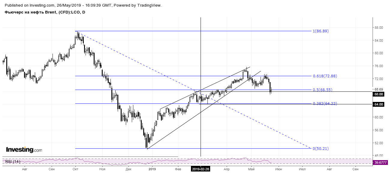 Спустя месяц мы наблюдаем, что клин пробит вниз и цель 68-67$ достигнута.