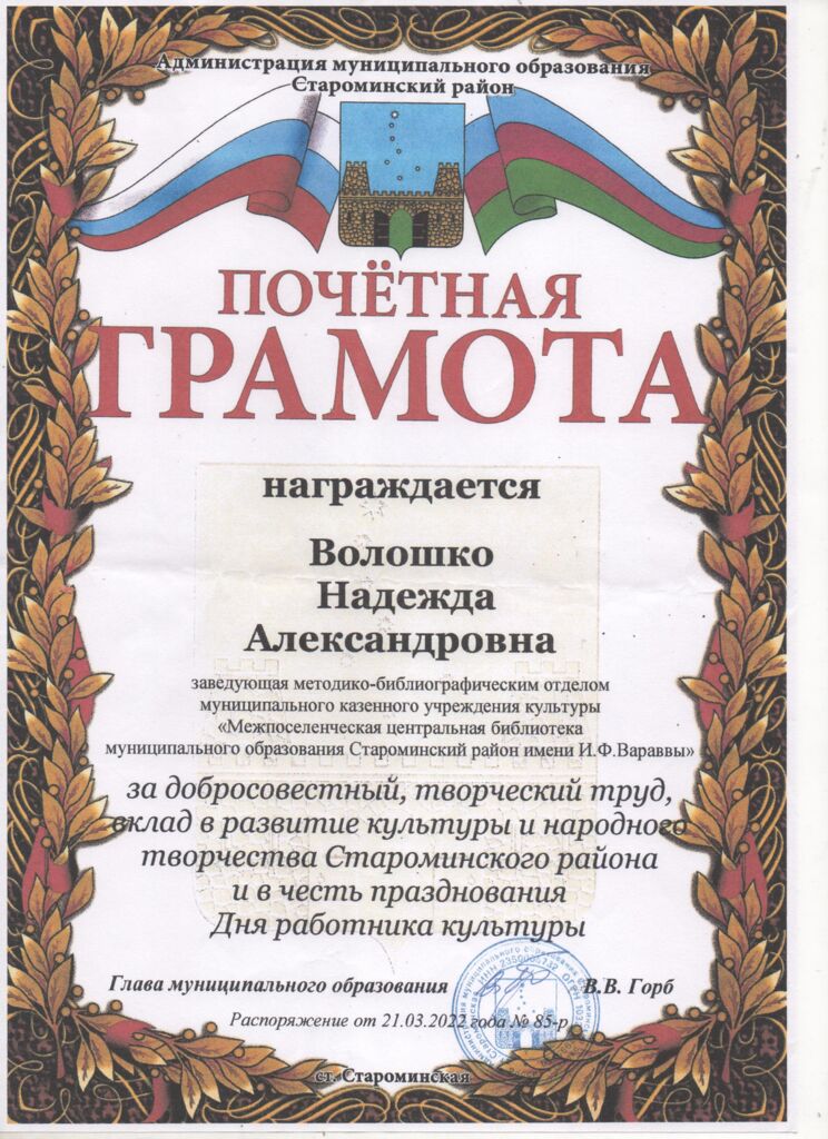 Текст грамоты за труд