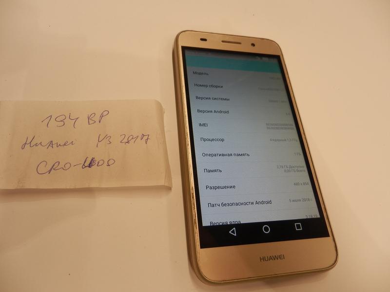 Specifications of the Huawei Y3 2017 CRO-U00 . Dimensions: 73 .7 x 145 .1 x 9 .45 mm, Weight: 180 g, SoC: MediaTek MT6580M, CPU: ARM Cortex-A7, 1300 MHz, GPU: ARM Mali-400 MP2, 416 MHz, RAM: 1 GB, 533 MHz, Storage: 8 GB, Display: 5 in, IPS, 480 x 854 pixels, 24 bit, Battery: 2200 mAh, Li-Ion, OS: Android 6 .0 Marshmallow .