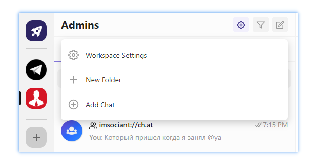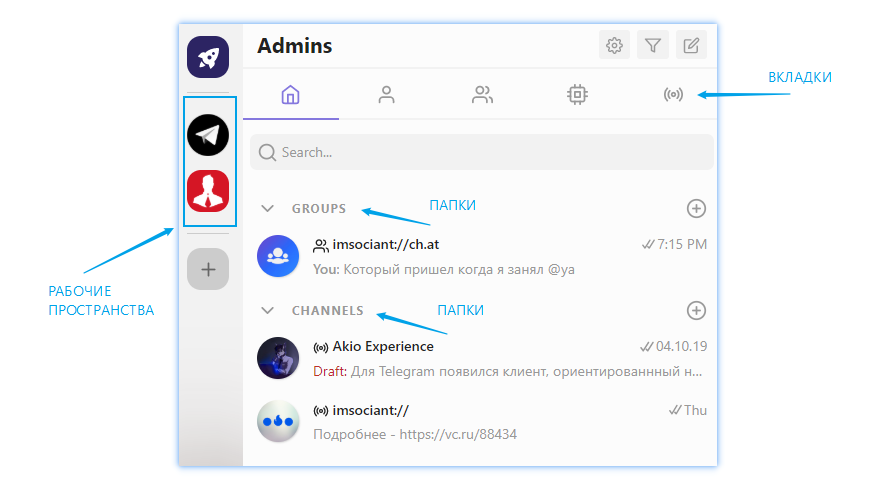 Можно создавать рабочие пространства и папки, добавлять туда любые выбранные чаты.