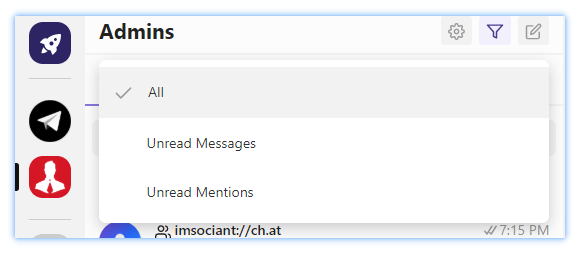 Из дополнительных фильтров — отображение в рабочем пространстве непрочитанных сообщений и непрочитанных упоминаний.