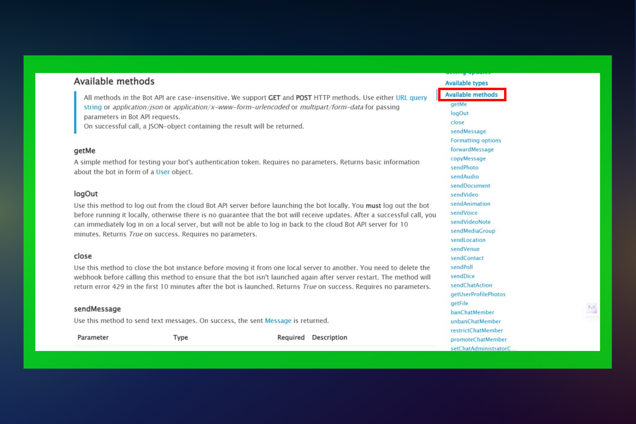 Название метода - это то самое действие, которое мы хотим совершить, например: отправить сообщение, получить геопозицию, отправить фото, получить мобильный телефон пользователя и т.д. Всего в Telegram API представлено 78 доступных методов 😎