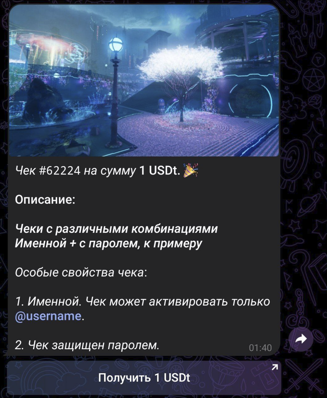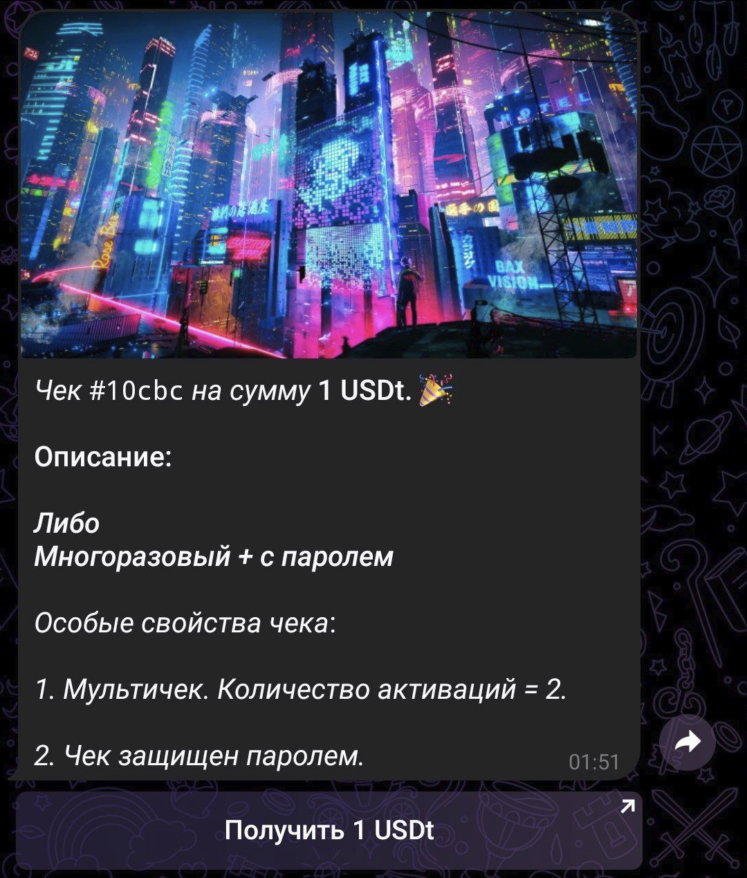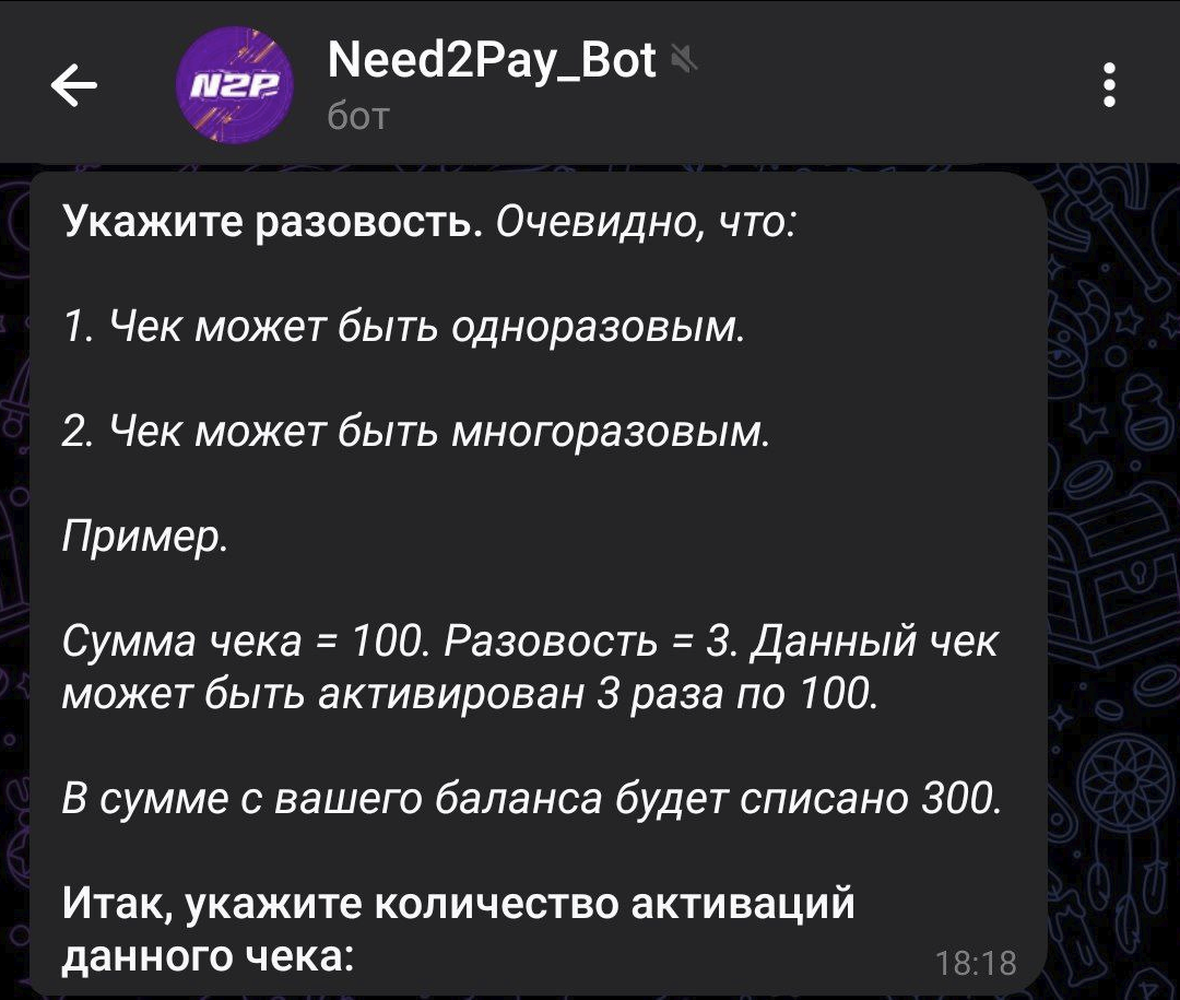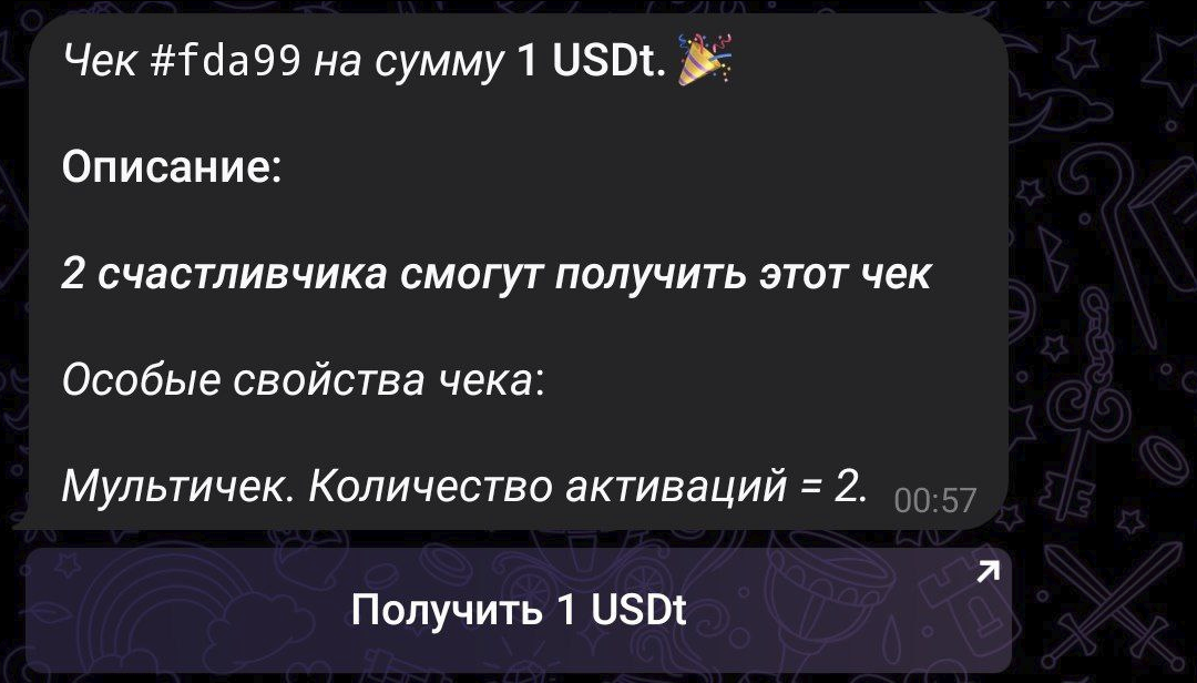 Многоразовый чек. Один аккаунт в Телеграмме может активировать чек лишь один раз.
