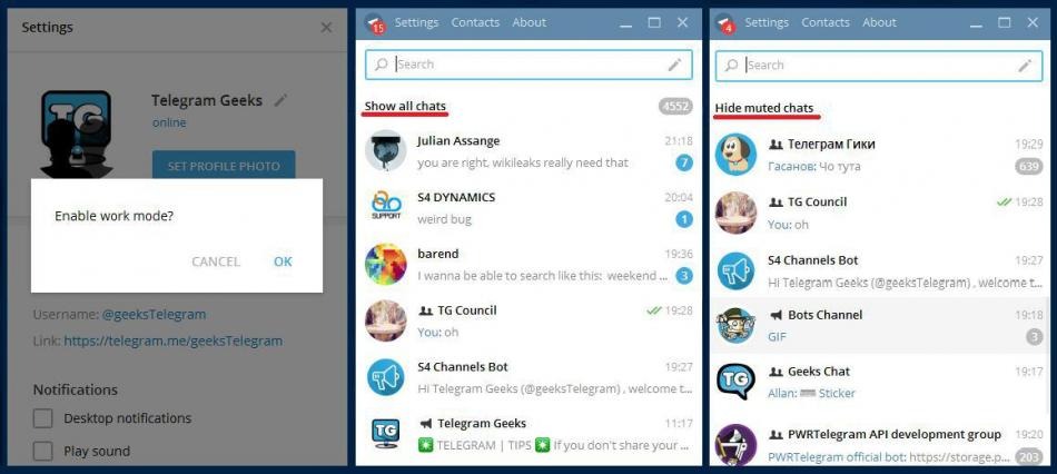 1. Telegram Desktop dasturida kerakli suhbatlar va keraksizlarini tartiblash uchun ajoyib usul. Barcha ovozi o'chirilgan chatlarni yashirish uchun Settings menyusiga kirib "workmode" so'zini yozib OK ni bosing! Shunga o'xshash ba'zi bir yashirin kodlar quyida keltirilgan: