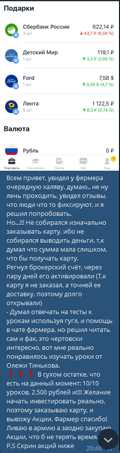 Проведём подсчёт, сколько мы можем заработать БЕЗ РЕФЕРАЛОВ: Принимаем мы участие сразу в нескольких акциях Тинькофф, чтоб словить максимальный профит. Всего мы получим 14 акций. 3 мелкие, до 100 рублей каждая, за репосты. 1 за открытие брокерского счёта. Тут уже повкуснее, падает акция до 20,000 рублей. Ну и самое сочное - это новая акция, в которой нам надо пройти "уроки для новичка". За каждый такой урок мы получаем рандомные акции (9 уроков, после каждого акции до 2500 рублей), самый последний (десятый урок) даёт самую вкуснятину, например акции Майкрософт за 200$ 😋