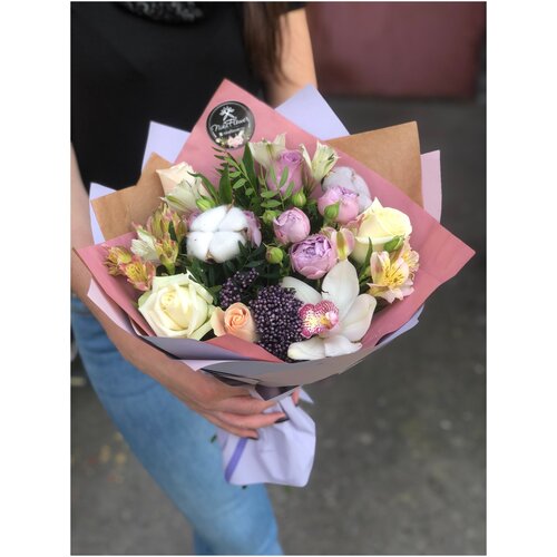 Composition : Orchidée Cymbidium - 1 pc. Ozothamnus - 1 pc. Alstroemeria - 3 pcs. Pistache - 1 pc. Emballage design - 1 pc.
