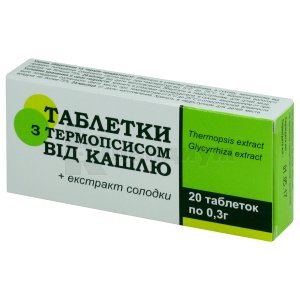 Таблетки с термопсисом от кашля 0 .3 г №10 - Инструкция по применению Состав Натрия гидрокарбонат - 240,0 мг, сыворотка молочная сухая - 42,0 мг, аэросил - 6,0 мг, кальция стеарат - 3,0 мг, МКЦ - 2,85 мг, КМЦ - 2,85 мг, экстракт термопсиса - 1,71 мг, экстракт солодки - 1,59 мг . Описание