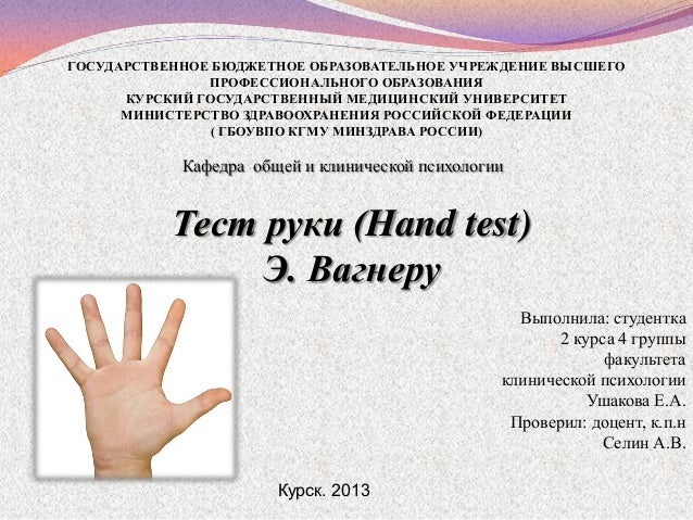 Тест руки — проективная методика исследования личности, разработанная в 1962 году Эдвином Е . Вагнером . Система подсчета баллов и коэффициенты разработаны 3 . Пиотровским . . .