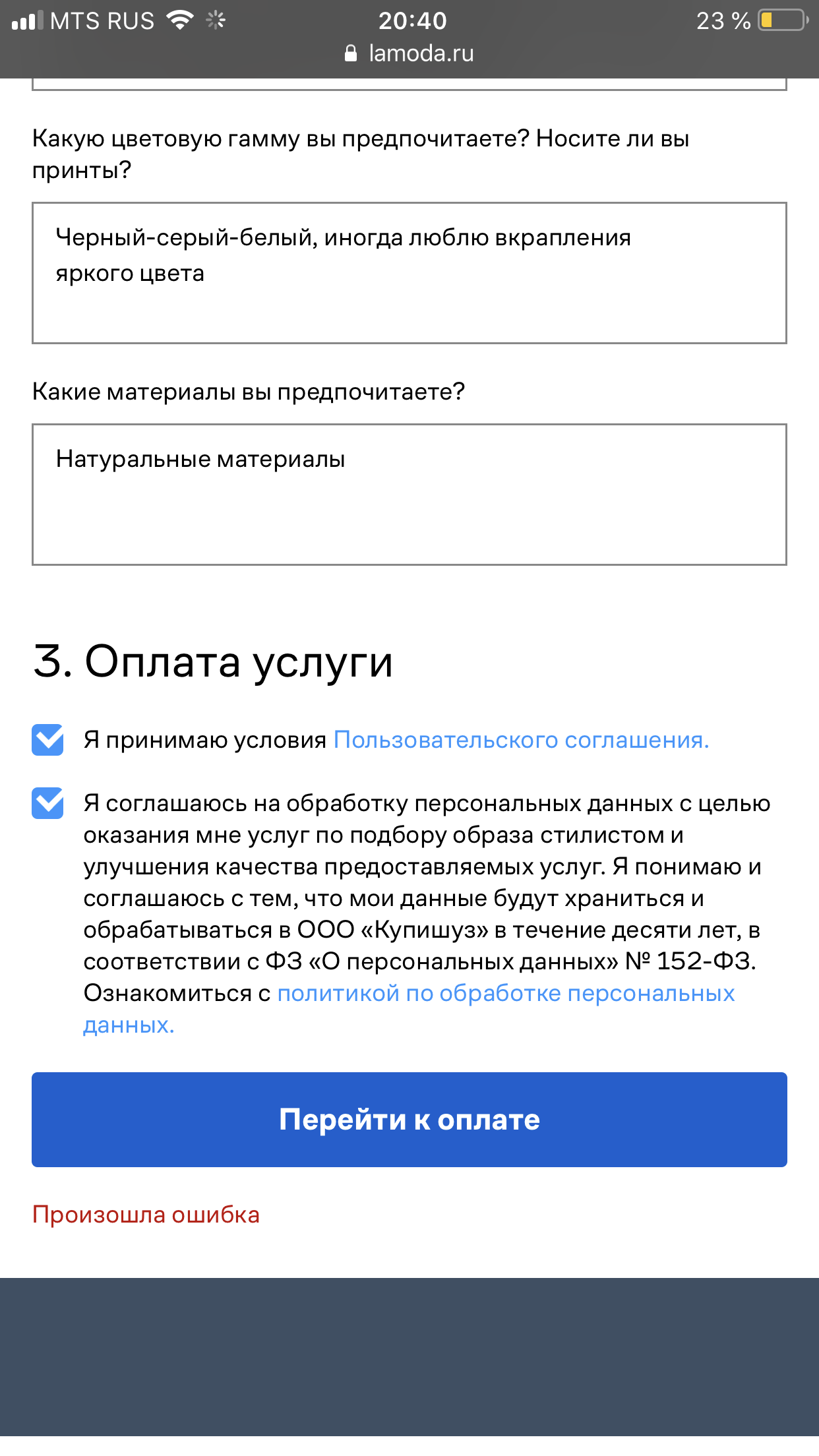 1. Участник заполняет подробную анкету на лендинге проекта и оплачивает услугу. Первое приятное впечатление — анкета абсолютно дружелюбная, без характерных для российского стилизма ограничений. Спросили размеры — и все. Единственный вопрос «Есть ли какие-то особенности вашей фигуры, которые вы хотели бы подчеркнуть или наоборот скорректировать?» — по-моему, отличная формулировка, которая дает полную свободу и одновременно бережно учитывает возможные страхи и нежелания. То же с цветами — никаких тебе цветотипов, просто выбираешь предпочтительную гамму.