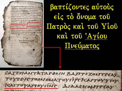 Tanto a Peshitta em aramaico quanto o manuscrito em hebraico de DuTillet falam em imersão em nome do Pai, do Filho e do Espírito. No mesmo sentido, dispõem os antigos textos gregos: 1) Codex Sinaíticus, 2) Alexandrinus, 3) Vaticanus, 4) Washingtonianus, 5) Bezae e 6) M-1141.