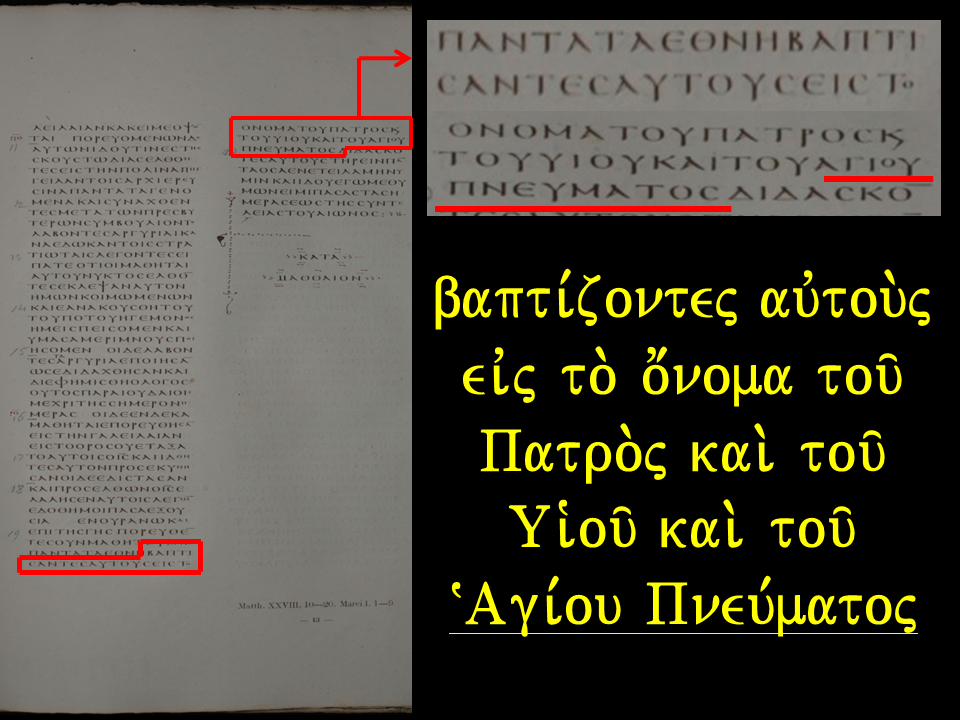 πορευθέντες οῦν μαθητεύσατε πάντα τὰ έθνη, βαπτίζοντες αυτοὺς εις τὸ όνομα τοῦ Πατρὸς καὶ τοῦ Υἱοῦ καὶ τοῦ Ἁγίου Πνεύματος·