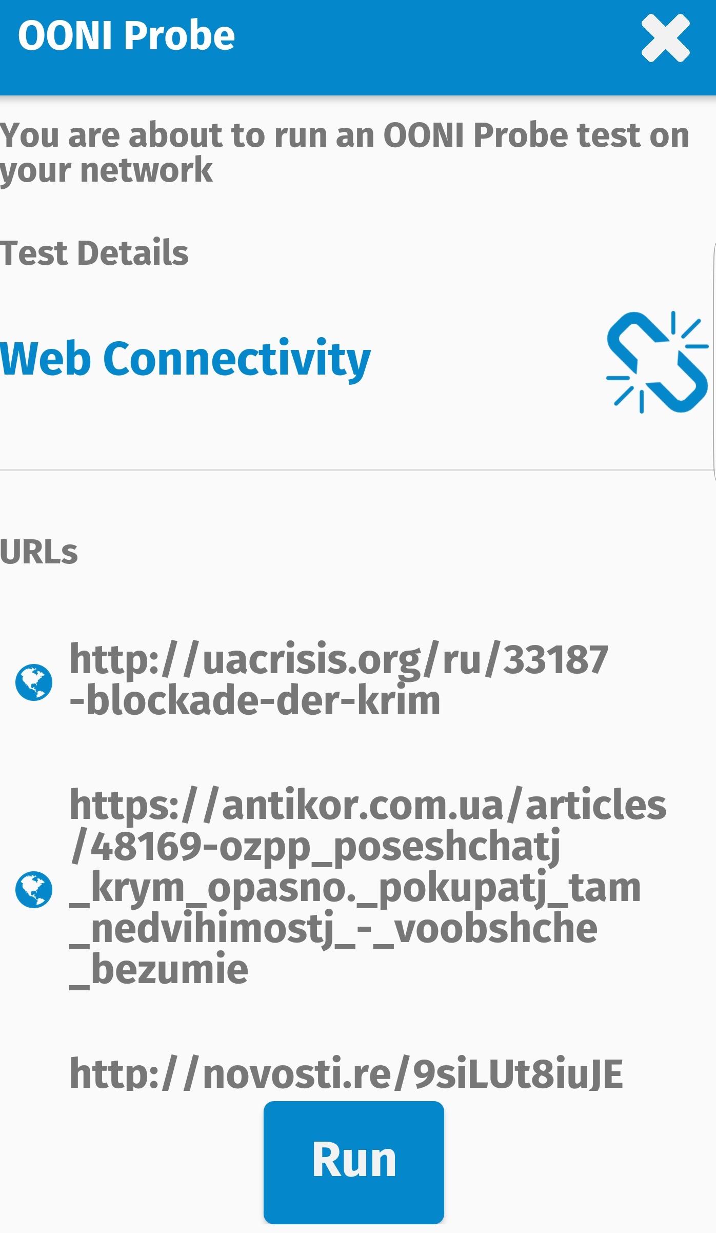 It is made up of select URLs from the Russian block list that ooniprobe will test. Click on the link only after installing the ooniprobe! The app will launch automatically into a screen like this: