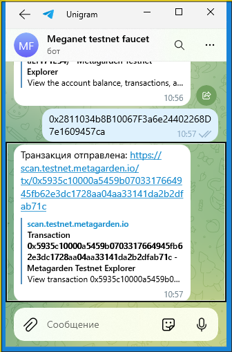 Бот ответит через некоторое время, что транзакция отправлена.
