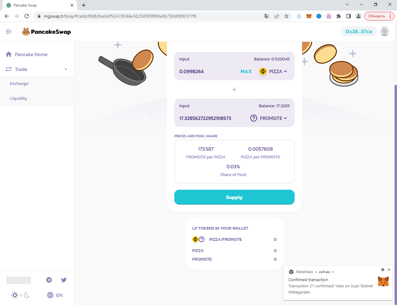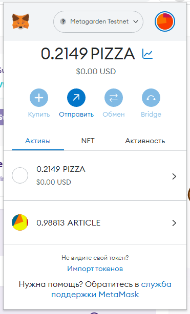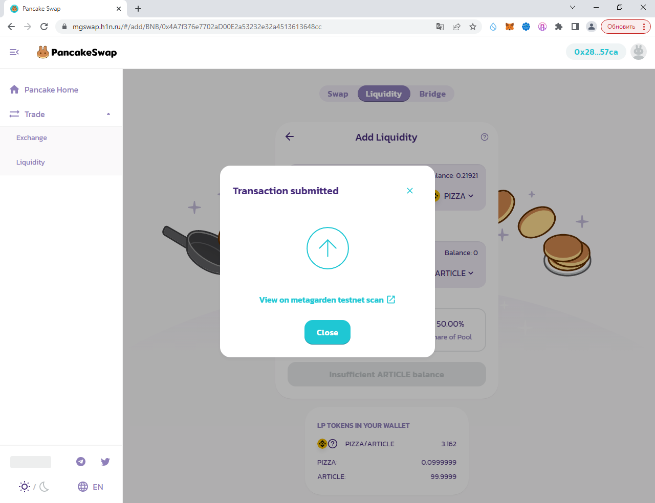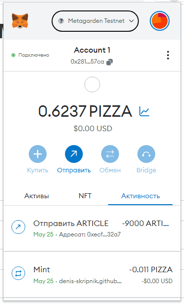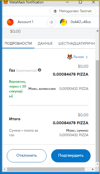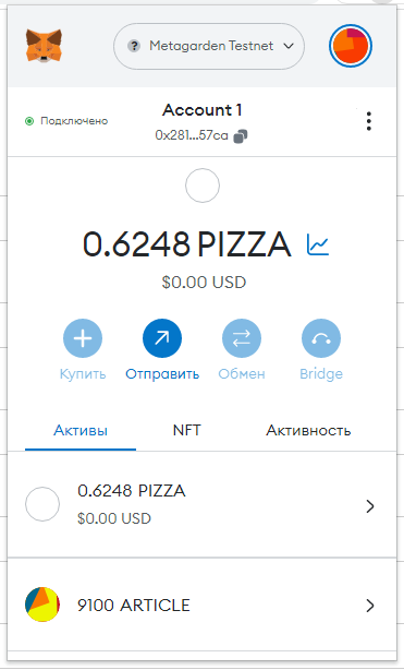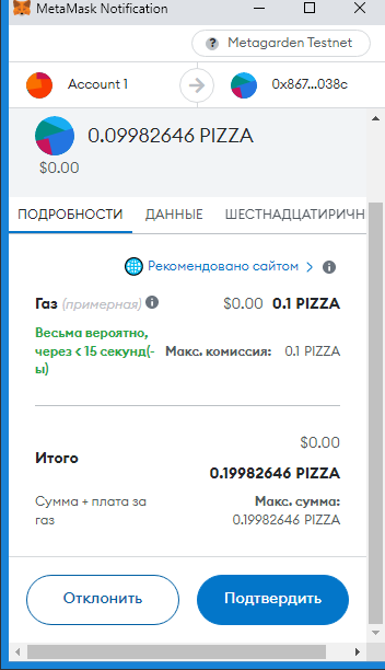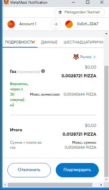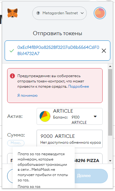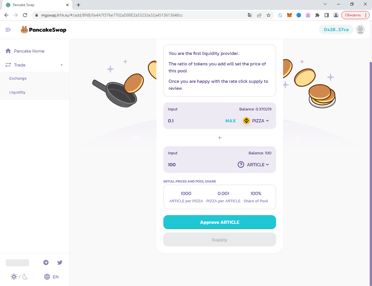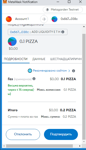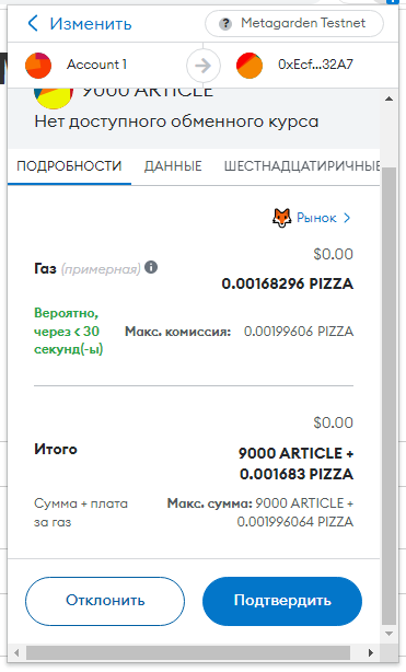 Заполняем суммы 0.1 PIZZA и ARTICLE (у вас другой токен):