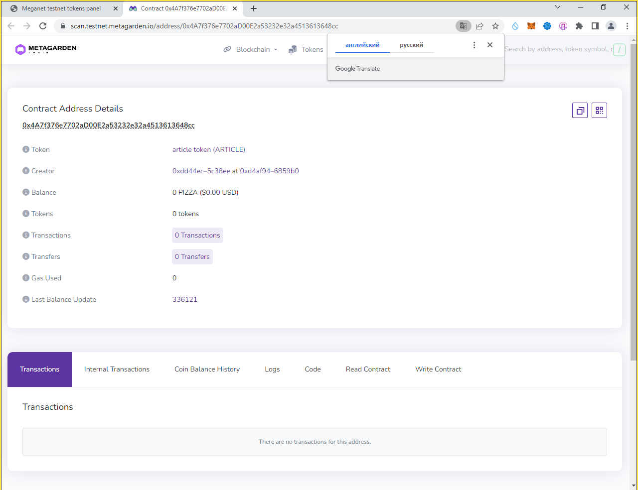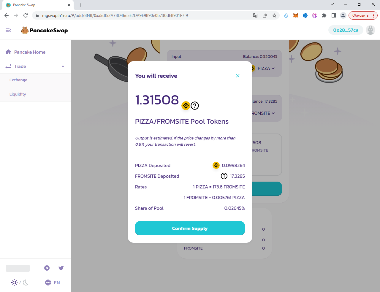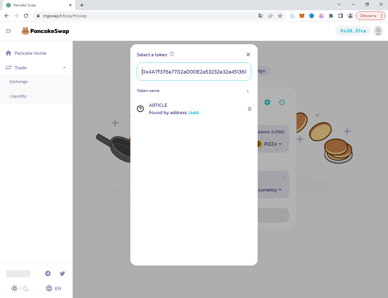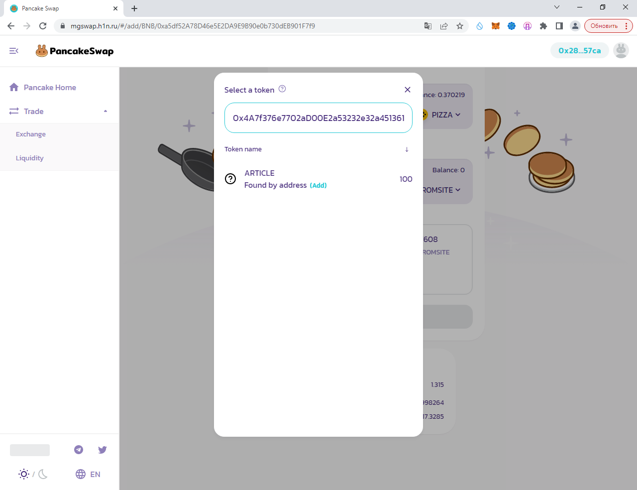 Заполняем суммы 0.1 PIZZA и ARTICLE (у вас другой токен):