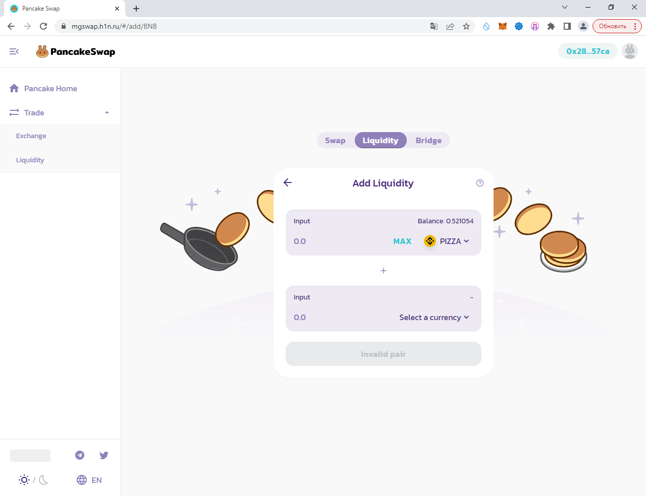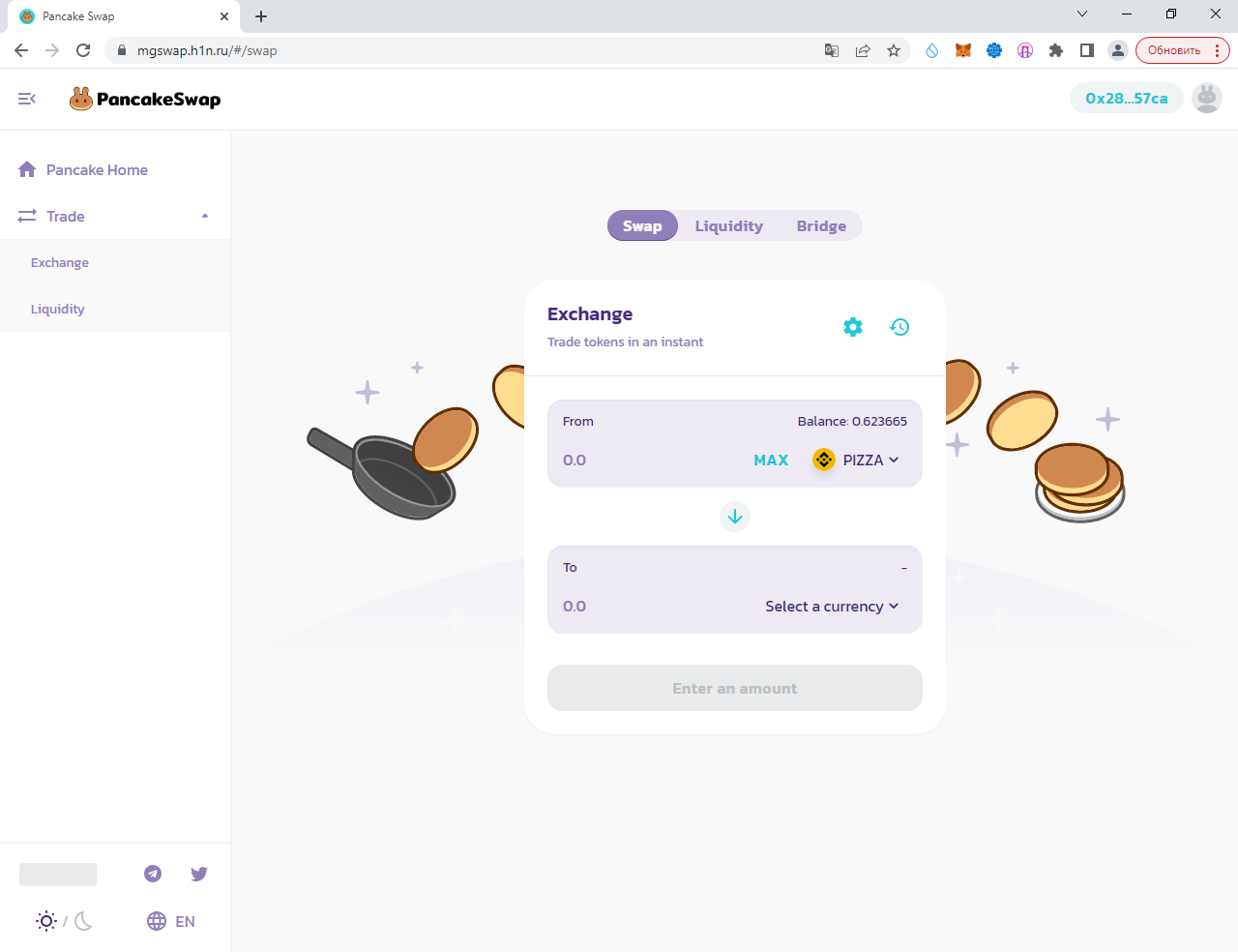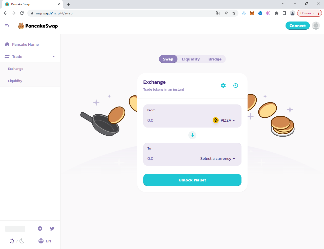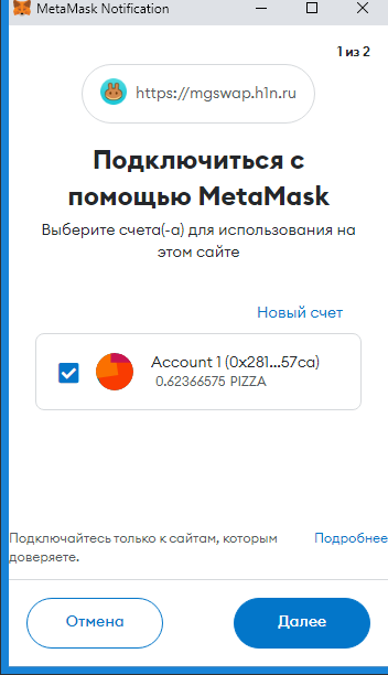 "Далее", "Подключиться", и всё. После этого вводим любую сумму (советую 0.1, т. к. получили всего 1 PIZZA) и выбираем один из вариантов: