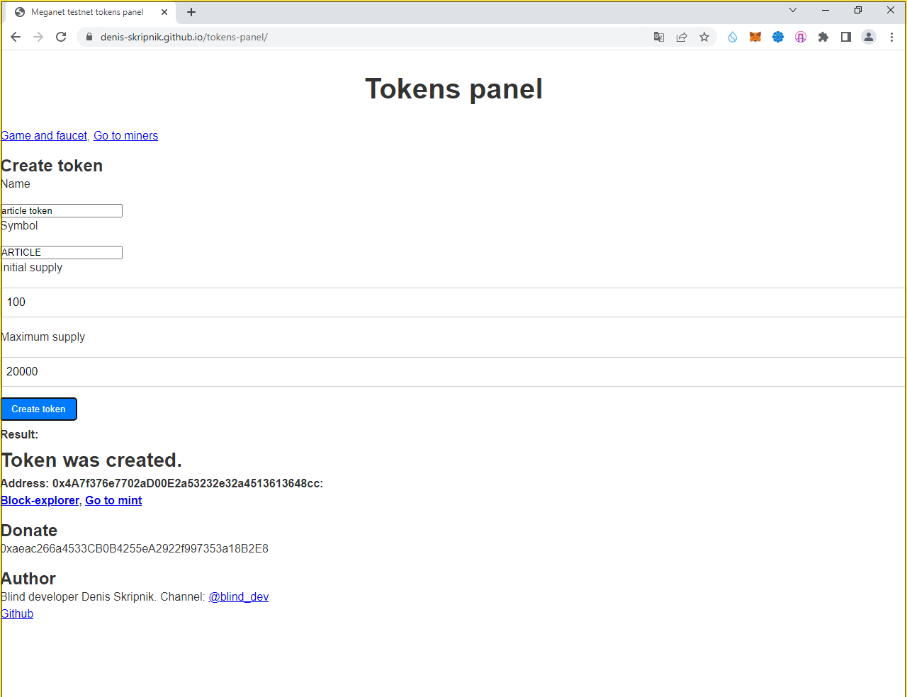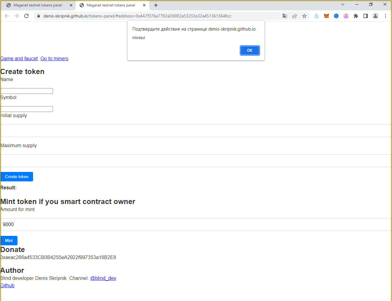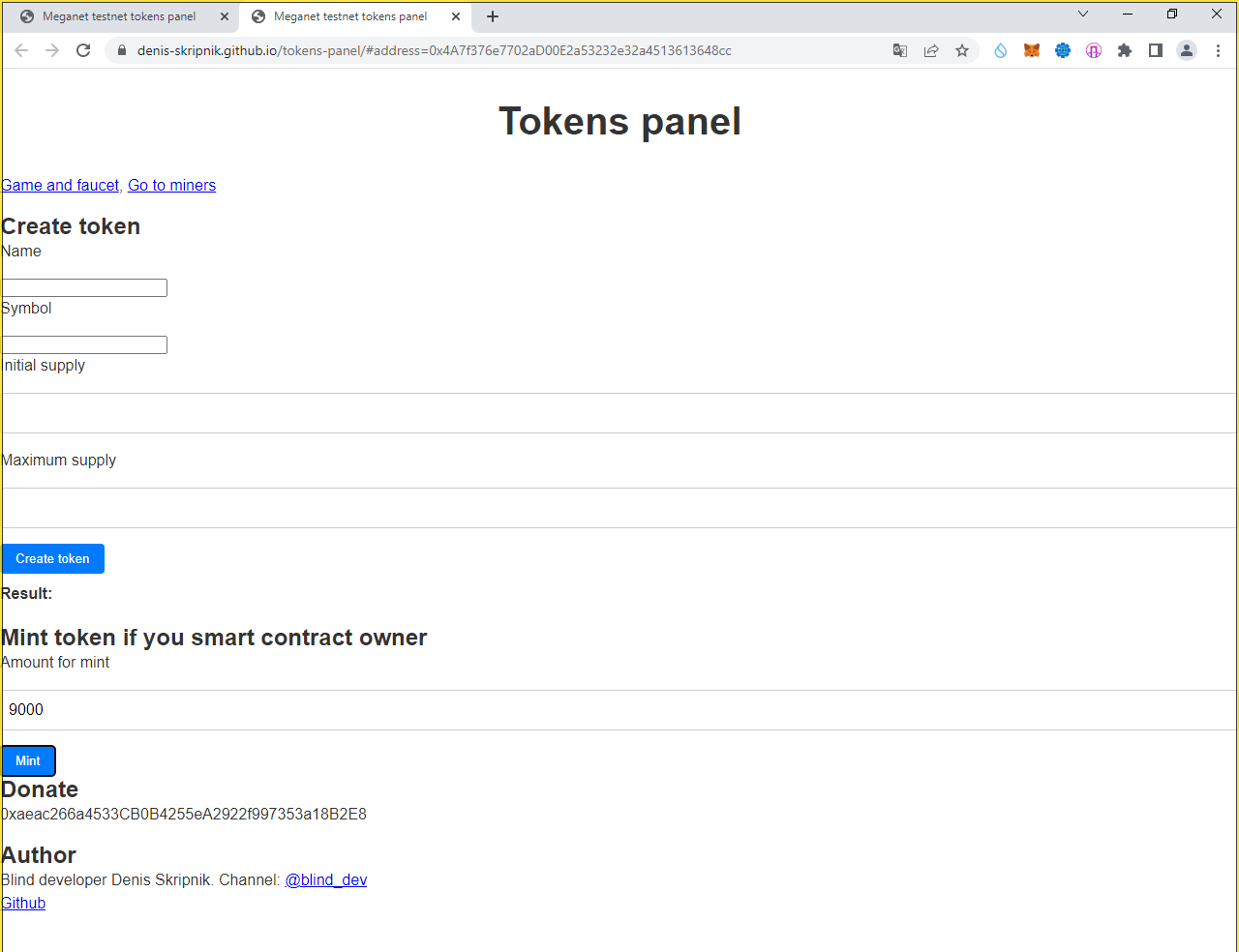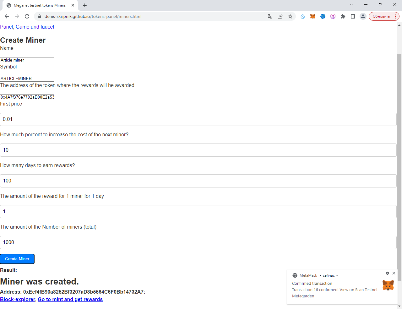 Переходим по ссылке "Go to mint and get rewards" - у меня это https://denis-skripnik.github.io/tokens-panel/miners.html#address=0xc6A6079642947BDb4D7a71681F5c27095752AAdF (у вас другая):