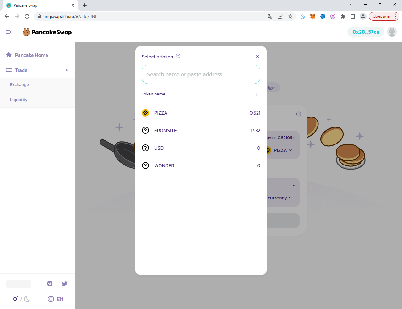 Также можем создать пул со своим токеном. Нажимаем на "FROMSITE" или "Select a currency" и вводим адрес смартконтракта (не майнера, а токена):