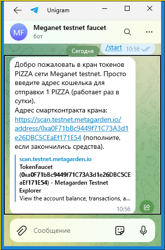 Далее идём в Metamask и копируем адрес, после чего запускаем бота https://t.me/mgtestFaucetBot