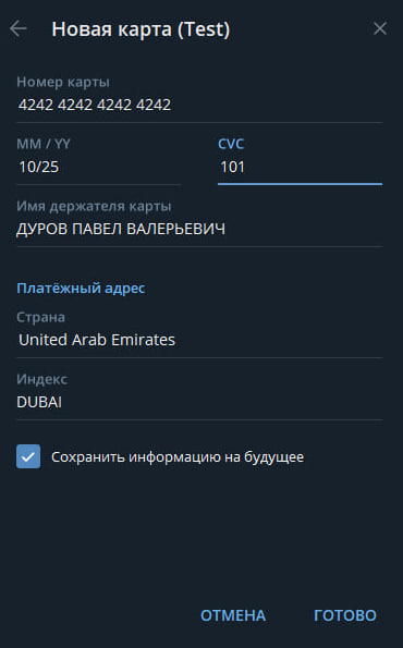 Нужно зайти в https://t.me/izpremiumbot, выбрать в способе оплате «Новая карта» и в номер карты написать номер «4242 4242 4242 4242», остальные данные вводите любые, главное чтобы были адекватные, например: