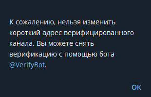 НО! После создания такого канала нельзя будет изменить юзернейм, есди вы попытаетесь это сделать то выйдет такое предупреждение: