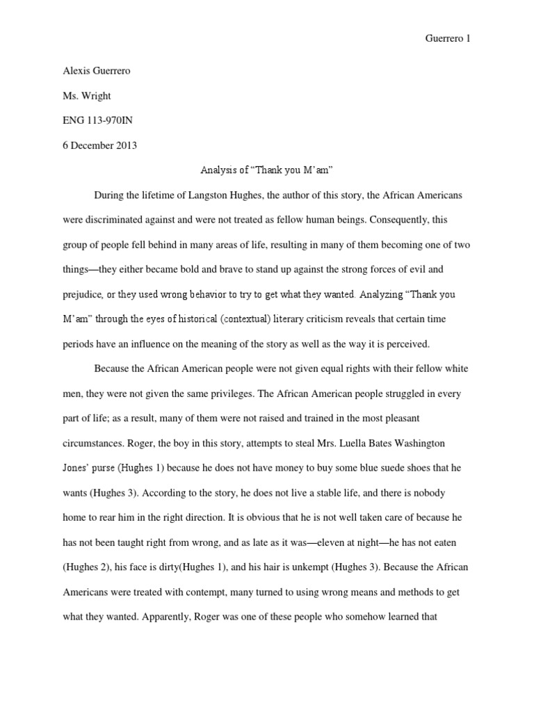 Literary Analysis Essay of Langston Hughes 'Thank You Ma'am' . Langston Hughes short story entitled 'Thank You Ma'am' is a unique piece that examines the interaction between Mrs . Luella Bates Washington Jones and Roger . It presents readers the notion of goodness and how it remains to be a personal decision and not necessarily . . .