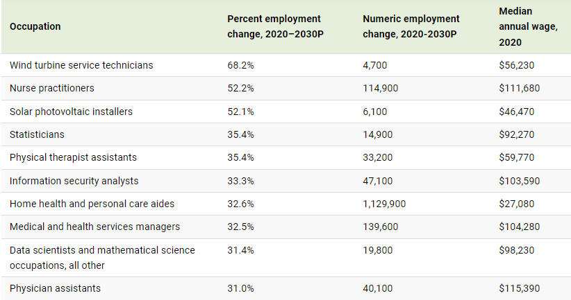 Computer and math-related jobs are also expected to see high growth. The BLS expects strong demand for IT security and software development, partly because of the increase in people that are working from home.