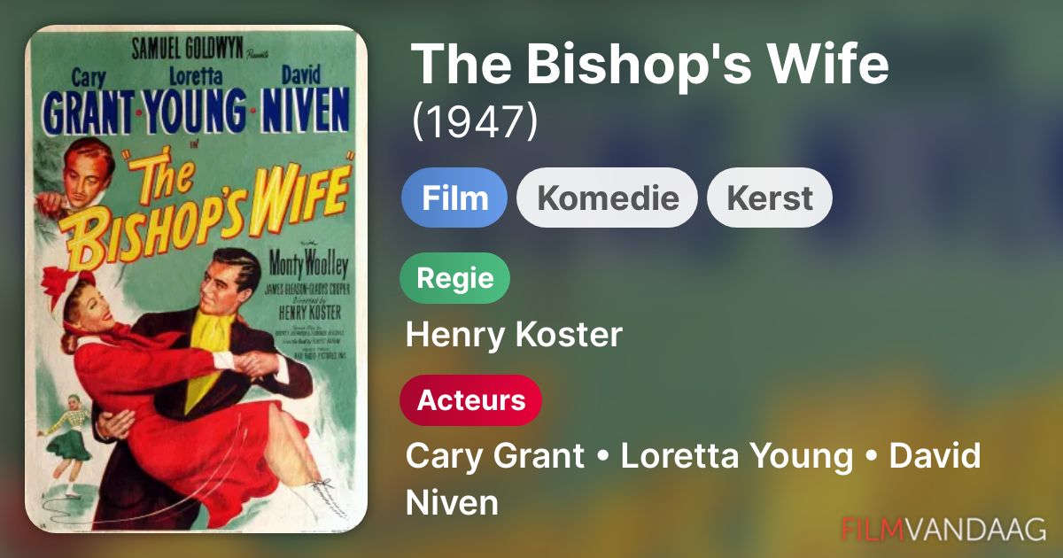 Перевести · The Bishop's Wife, also known as Cary and the Bishop's Wife, and also known by the distribution title Honni soit qui mal y pense, is a 1947 Samuel Goldwyn romantic comedy feature film directed by Henry Koster and starring Cary Grant, Loretta Young, and David Niven. The plot is about an angel who helps a bishop …