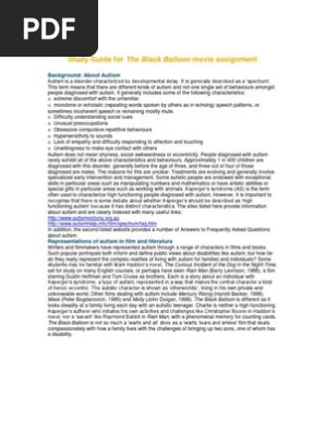 This paper is based on The Black balloon movie (2008), an award winning film that features how autism affects one military family . From a medical point of view, autism is a development disorder that affects behavioural patterns of the affected person . The dominant characters in the movie are Charlie Mollison who suffers from Autism and . . .