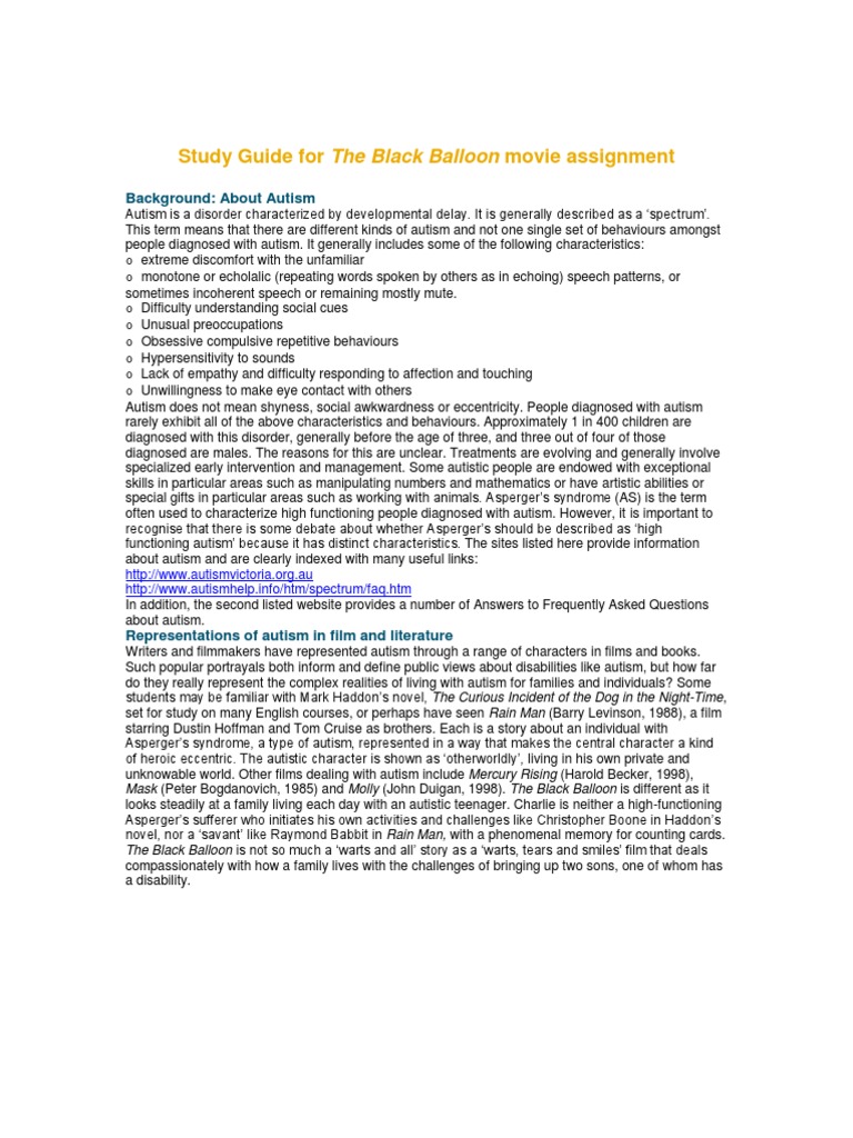 Essay , Pages 4 (888 words) Views . 279 . INTRODUCTION: The Black Balloon directed by Elissa Down is a film about a family living with an autistic son . Throughout the movie, Thomas feels embarrassed being Charlie's brother, he feels left out not only at school but at home too . Get to Know The Price Estimate For Your Paper .