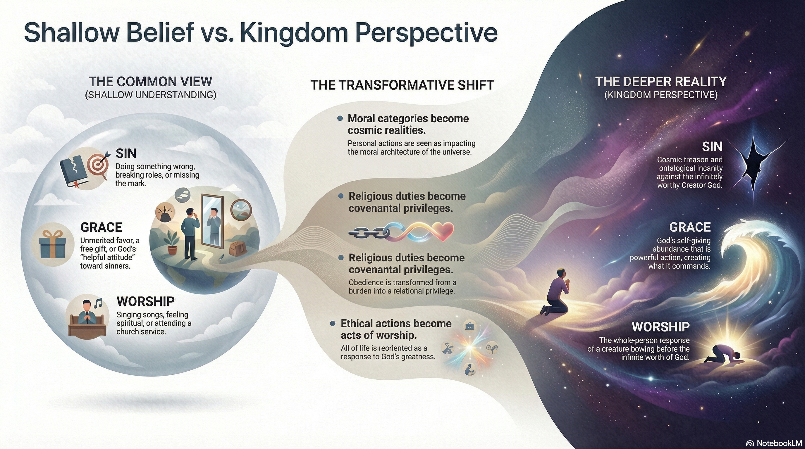 Covenant vision begins when the church recovers a God-centered frame: teaching is no longer a religious label for personal gain, but a reality weighed against the infinite majesty of the I AM. Such reorientation reorders everything: creature life is viewed as reference to the self-existent Maker, whose Being is the sole absolute standard of reality. In this framework, rebellion is not a minor mistake but cosmic betrayal: a attempt by the finite to claim independence from the Fountain of life. Holiness then is not mere morality, but the Lord's essential apartness and cleanness that exposes defilement. Repentance is therefore not mere regret, but a covenantal return from self-sovereignty to the rule of the Lord, a realignment of volition, affections, and reason. Righteousness emerges covenantal fidelity and moral congruence with God's own nature, not a self-built status. Mishpat is God's living upholding of His right order, so orgÄ is not temper but settled pure resistance to evil. Mercy and grace are not permission; they are the Trinitarian God acting to recreate human being without diluting justice. In salvation, the cross is the Creator stepping into death to carry wrath and secure reconciliation; new birth is the Spirit life-imparting invasion that forms trust and begins transformation. Practically, this Kingdom perspective yields serious worship, truth-formed prayer, ethical congruence, and mission compelled by God's gravitas rather than comfort. One covenantal lens also recasts how we perceive the Lord: illumination is not fresh disclosure, but the Spirit-driven work of opening the eyes of the heart to see the worth of God in the Son by Scripture. Since the Lord is non-material and aseity-grounded, this seeing goes beyond mere unaided reason, overcoming the mind-darkening effects of rebellion. Within the same frame, prophetic speech is not only prediction, but Spirit-borne proclamation of God's oath-bound intentions, showing that time is teleological and moves toward the completion of God's Kingdom. Covenant, then, is the binding relational structure by which God commits His name to His creation, not as merely human agreements, but as God-grounded oaths guaranteed by His faithfulness. Kingdom Perspective