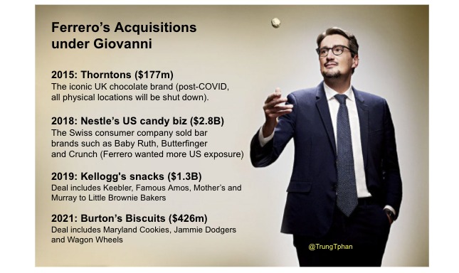 Since 2015, Giovanni has spent ~$5B -- on chocolate, candy and snack brands -- to take the crown, with the moves expanding Ferrero's footprint in the US and UK.
