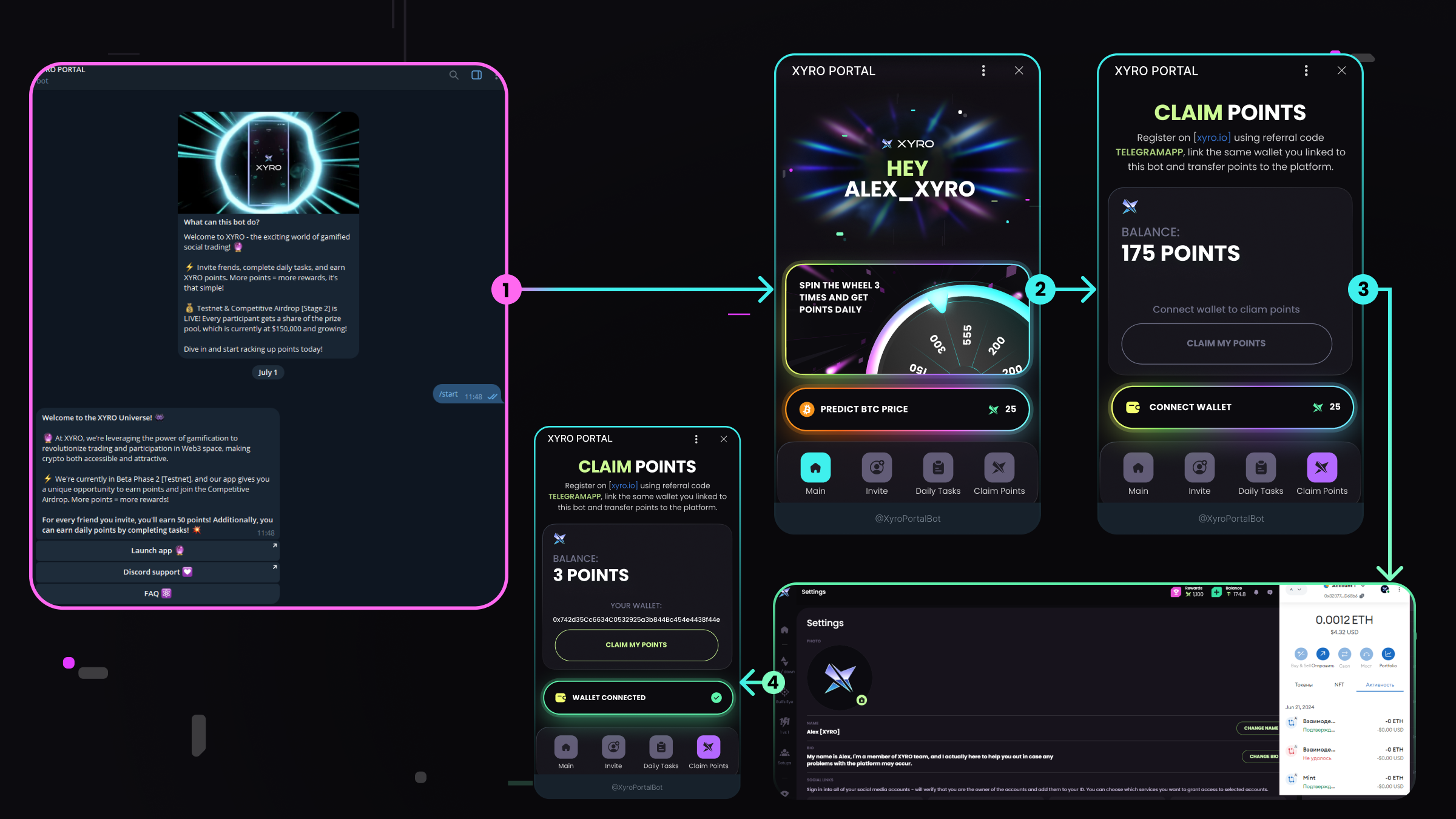 1. First, you need to go to t.me/XyroPortalBot and use /start.