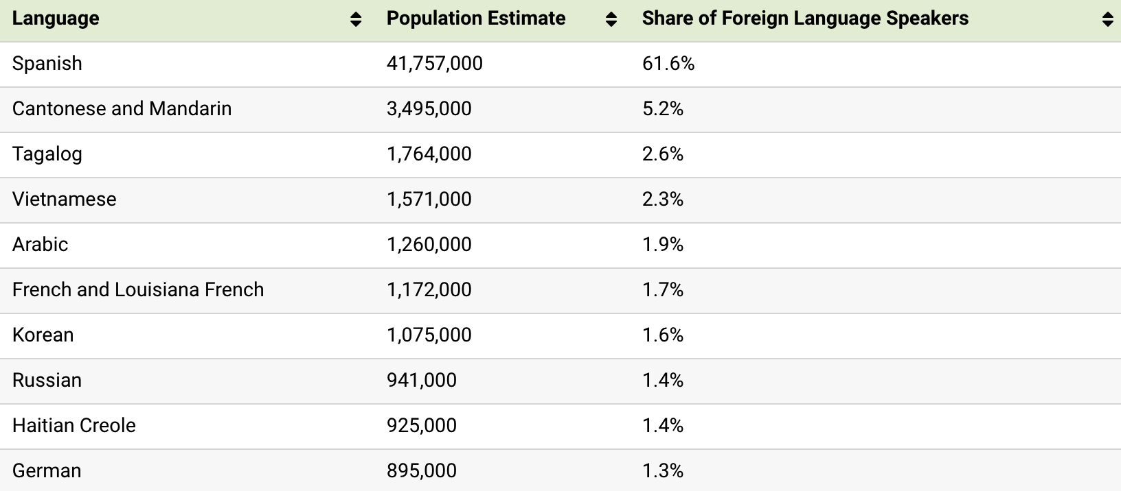 Tagalog is the second most commonly spoken language in American households (after English/Spanish) with 1.7 million speakers, even though it only reaches top spot in Nevada. Unsurprisingly, Louisiana and states bordering eastern Canada have a healthy number of French speakers.