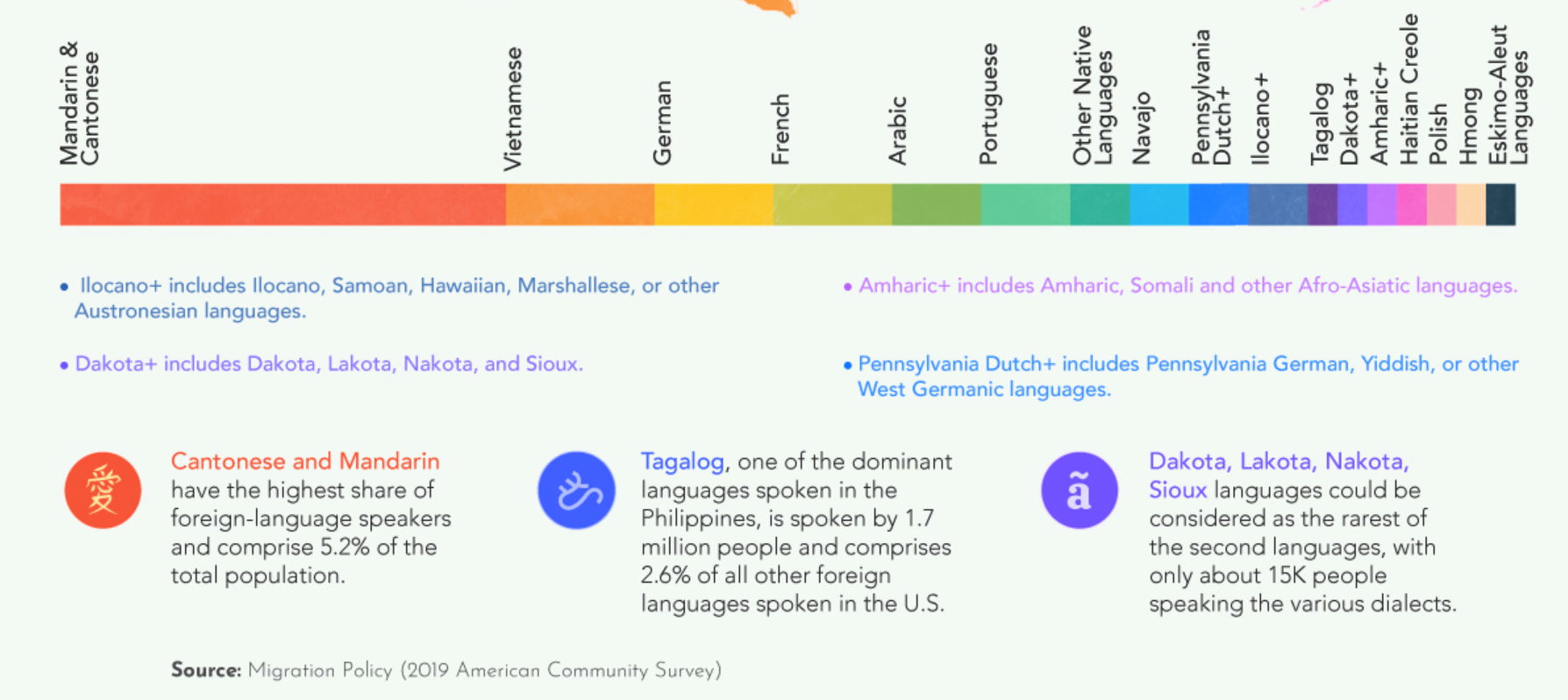 Migration Policy has used this data (while excluding English and Spanish) to leave us with the next-most-frequently spoken languages at home in each state.