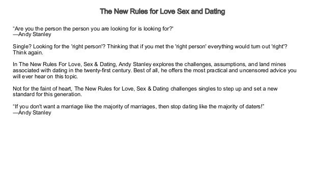The New Rules for Love , Sex and Dating challenges singles to set up and set a new standard for this generation . The New Rules for Love , Sex, and Dating - DVD . BUY NOW . The New Rules for Love , Sex, and Dating - Study Guide . BUY NOW . The New Rules for Love , Sex, and Dating - Bundle set . BUY NOW . Speaker: Andy Stanley .