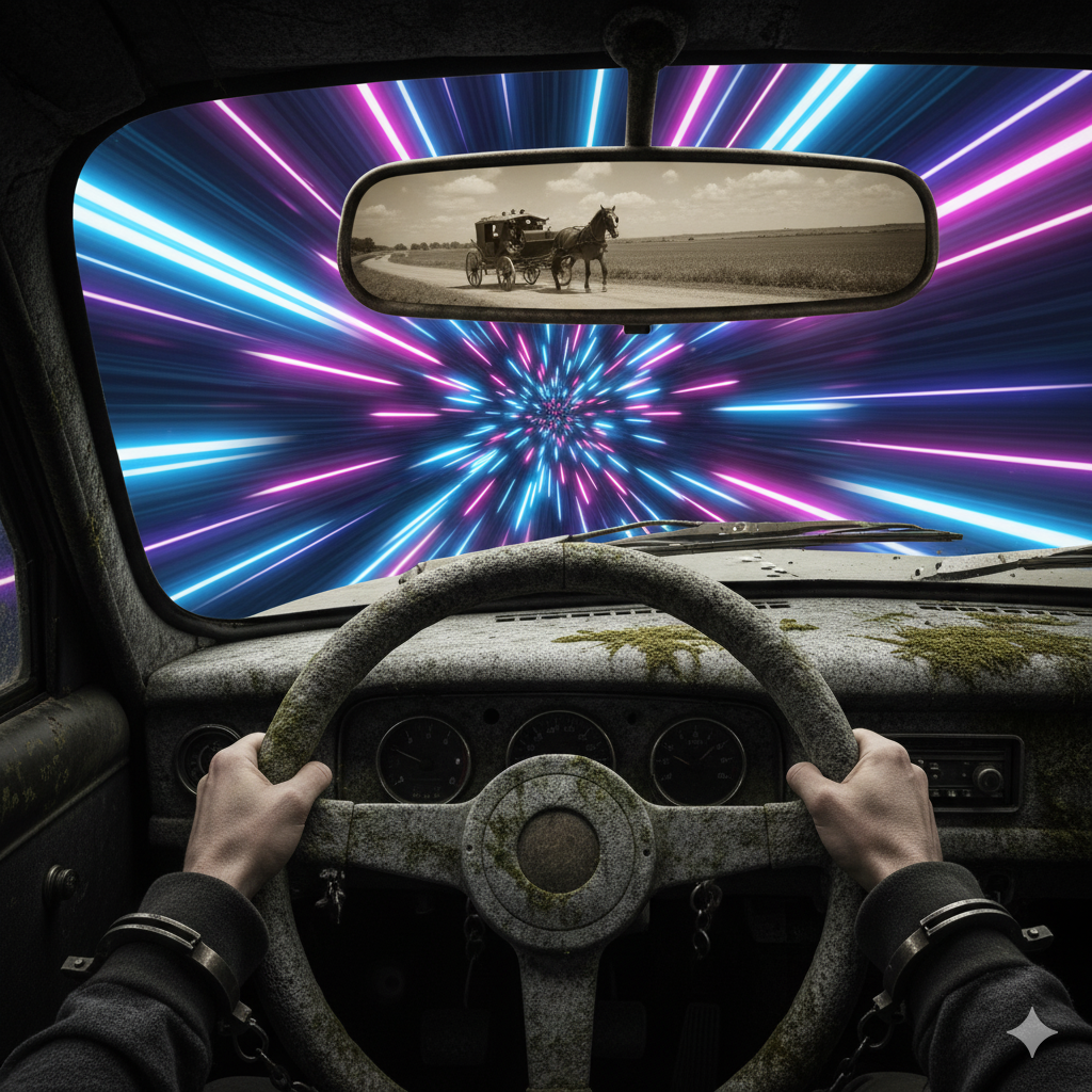 The "Rearview Mirror Trap" is comfortable for them, but it is a coffin for you. Unbuckle your seatbelt, open the door, and jump. The landing might be rough, but at least you’ll be moving forward.