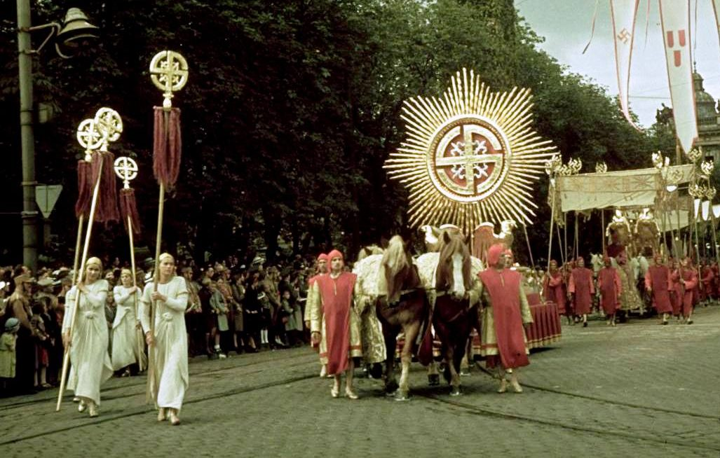 "Starting 1939 the word "Christmas" was forbidden to appear on any official SS document" and the Summer Solstice was formally celebrated. These ceremonies were celebrated the old way with sacred fires, and torch lit processions."