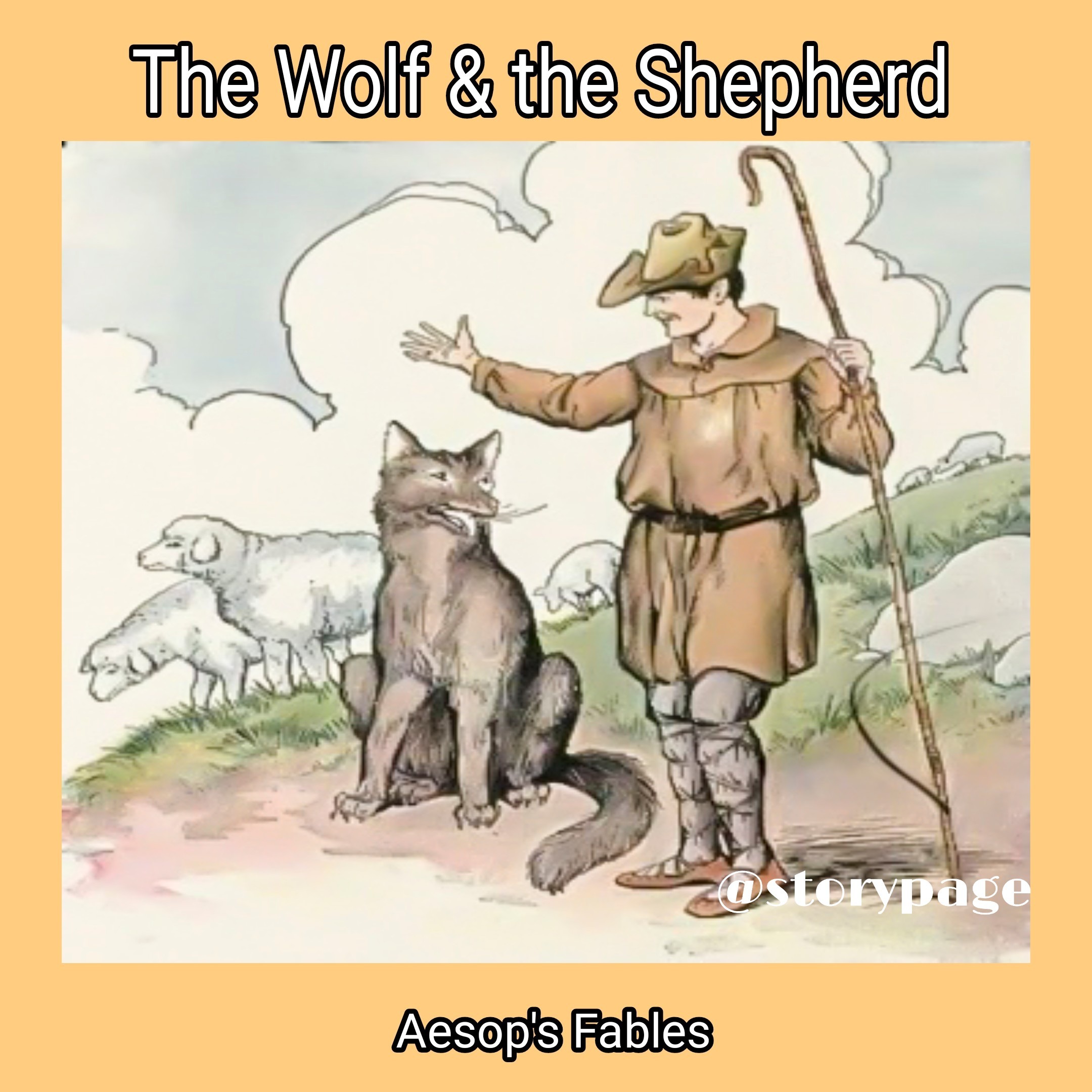 A Wolf had been prowling around a flock of Sheep for a long time, and the Shepherd watched very anxiously to prevent him from carrying off a Lamb. But the Wolf did not try to do any harm. Instead he seemed to be helping the Shepherd take care of the Sheep. At last the Shepherd got so used to seeing the Wolf about that he forgot how wicked he could be.