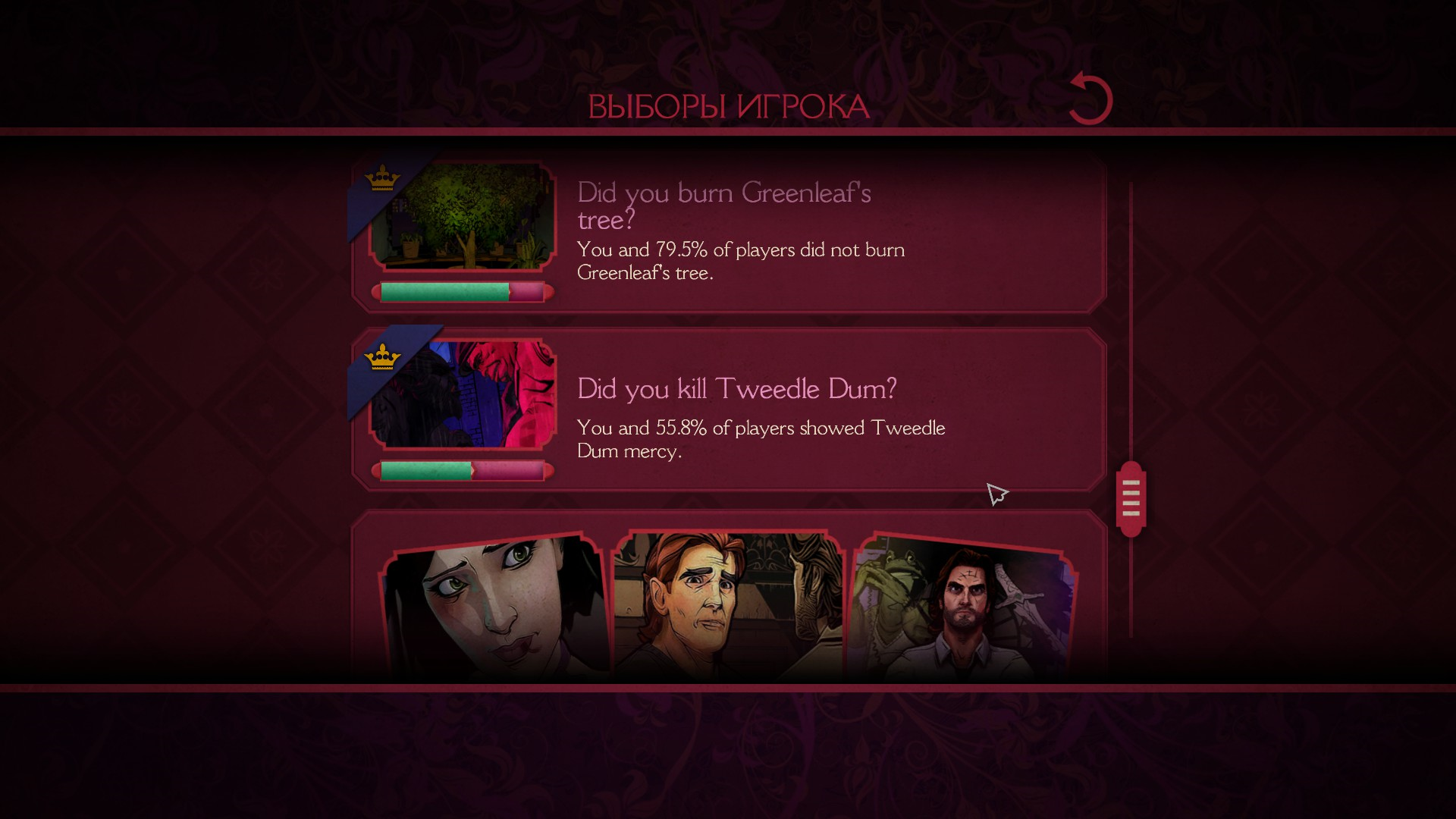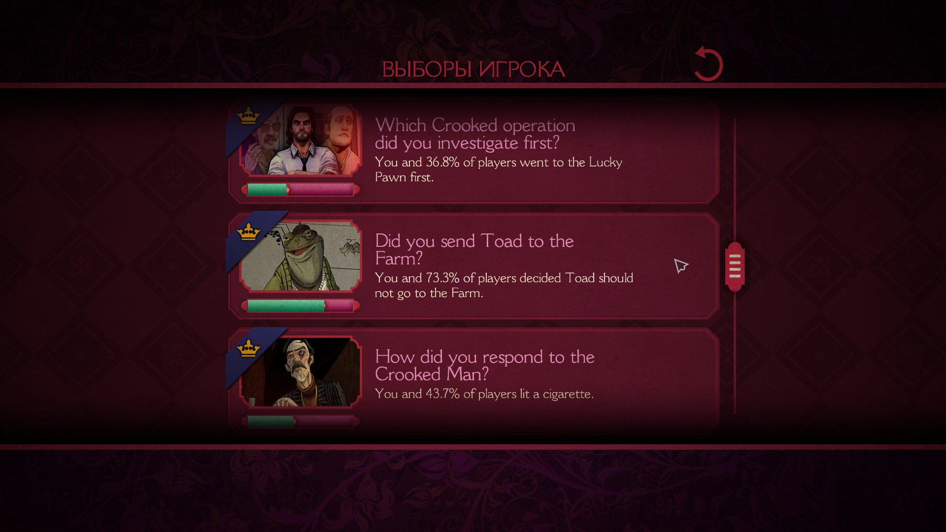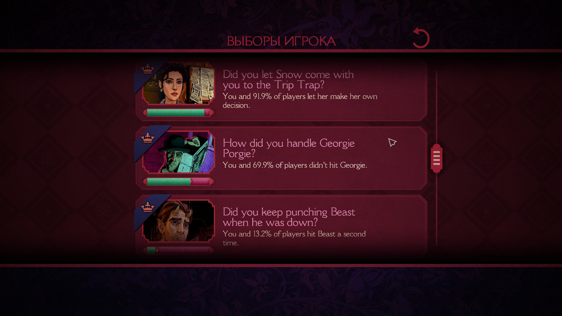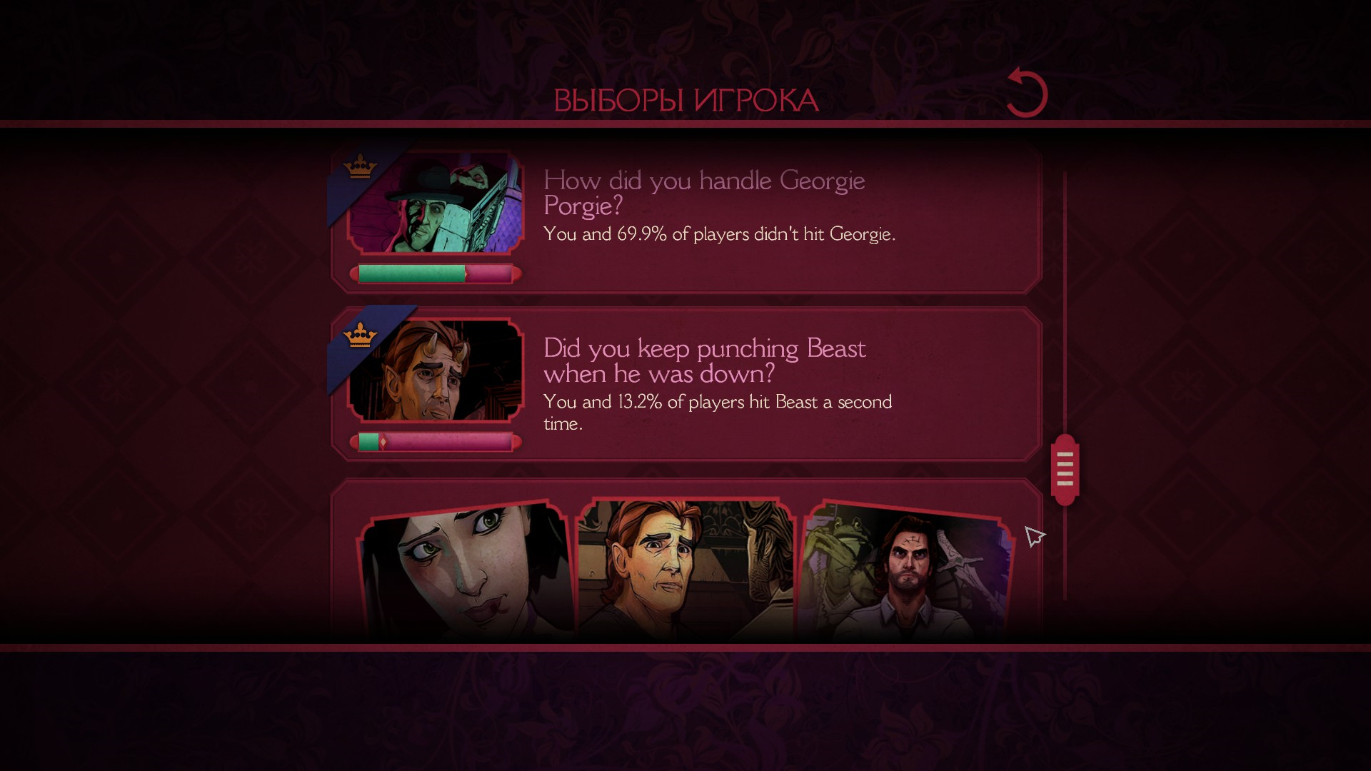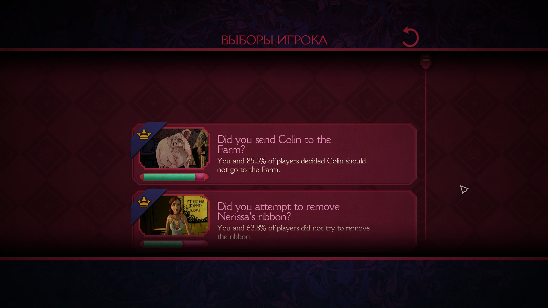Также, после каждого эпизода можно посмотреть выборы, которые сделал игрок, а также глобальную стату по всем игрокам.