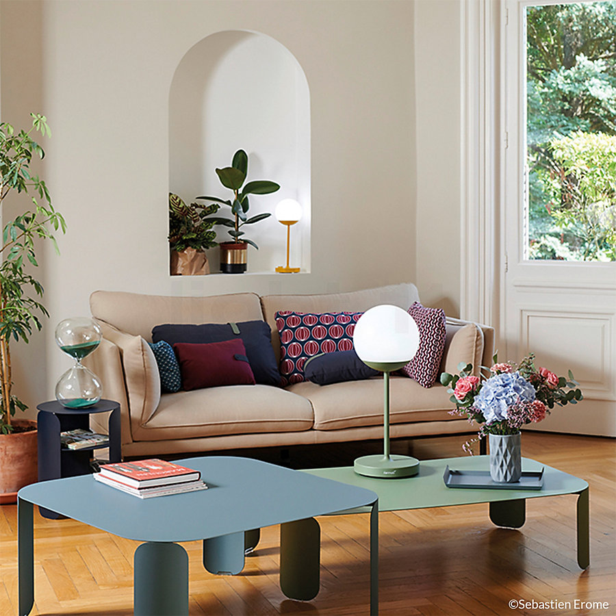 The lamp is on the coffee table