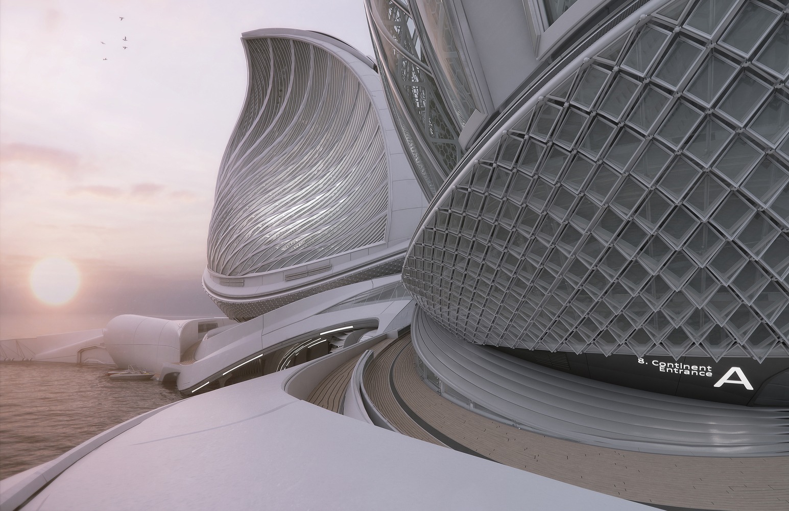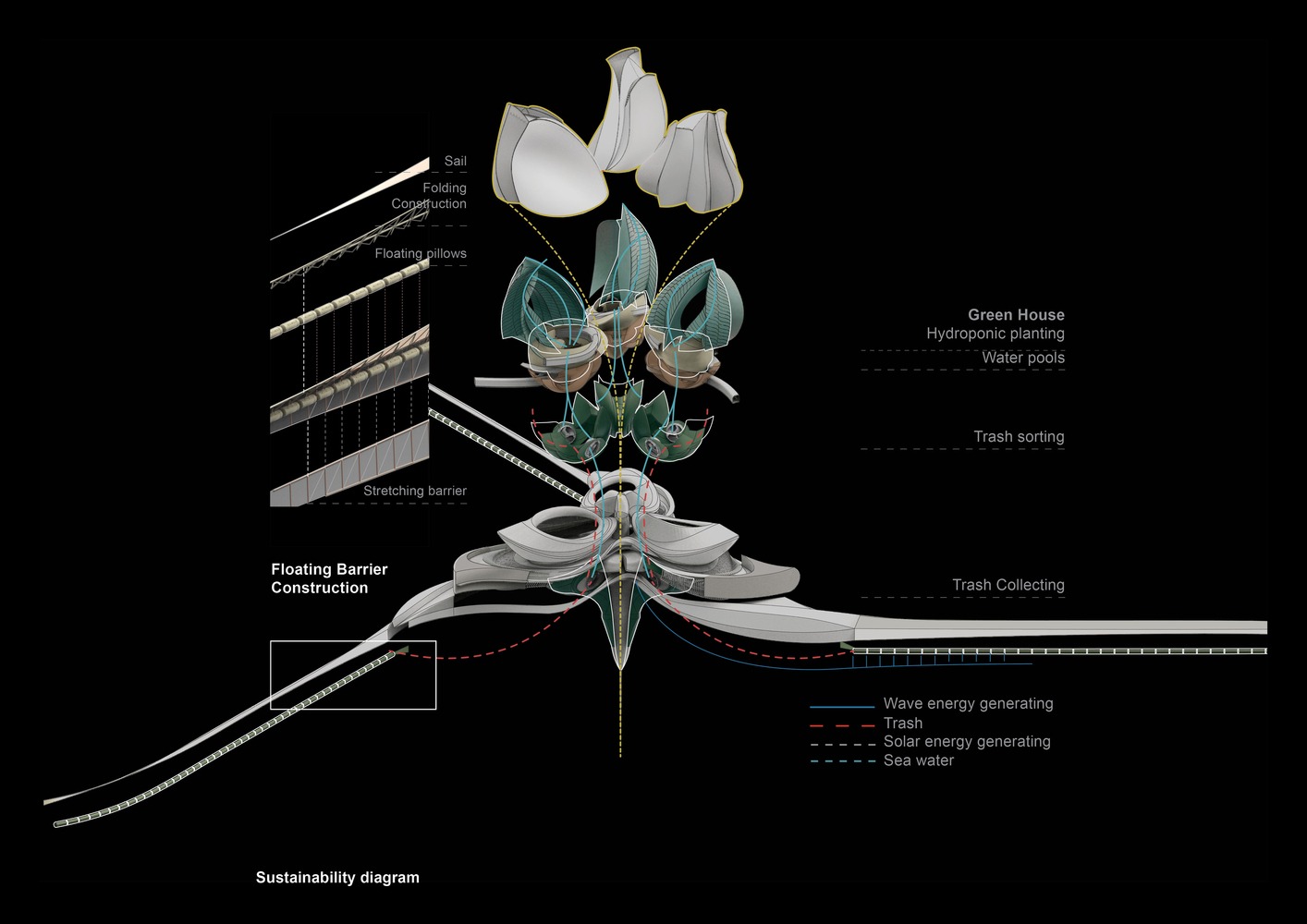 The Research and Education Centre is to study and showcase marine environments. This part is linked to the Collector and Greenhouses to follow the water processes and research them.