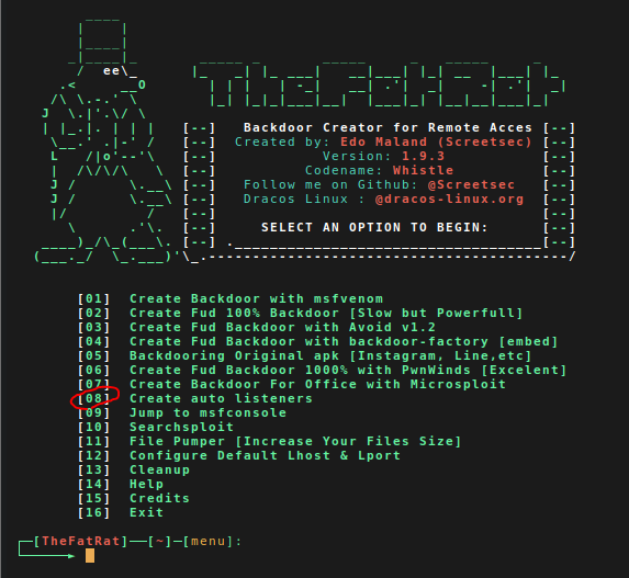Теперь у нас есть полезная нагрузка, нам нужно настроить листенер (слушатель) и вернуться в главное меню TheFatRat. Для этого переходим в 8 раздел в главном меню: