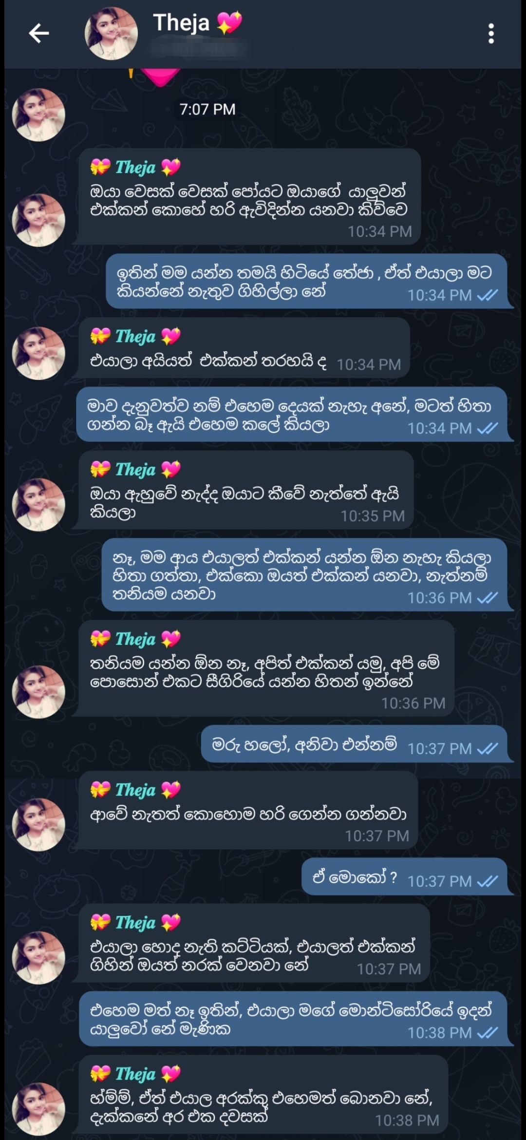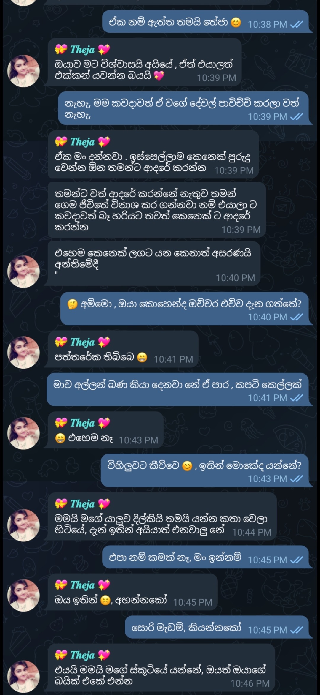"ඔයාට වැරදීමක් වෙලා , යං තේජා " කියලා මම තේජා වත් එක්කන් ආපහු එන්න ආවේ,
