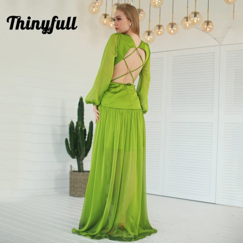 "Thinyfull Green Simple Prom Dresses V-neck Irregular A Line Floor Length Puff Sleeve Hollow Out Evening Party Gowns Custom Size" * Buy Now Just For 88$