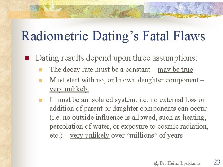 Three assumptions that radiometric dating relies on - Find . . .